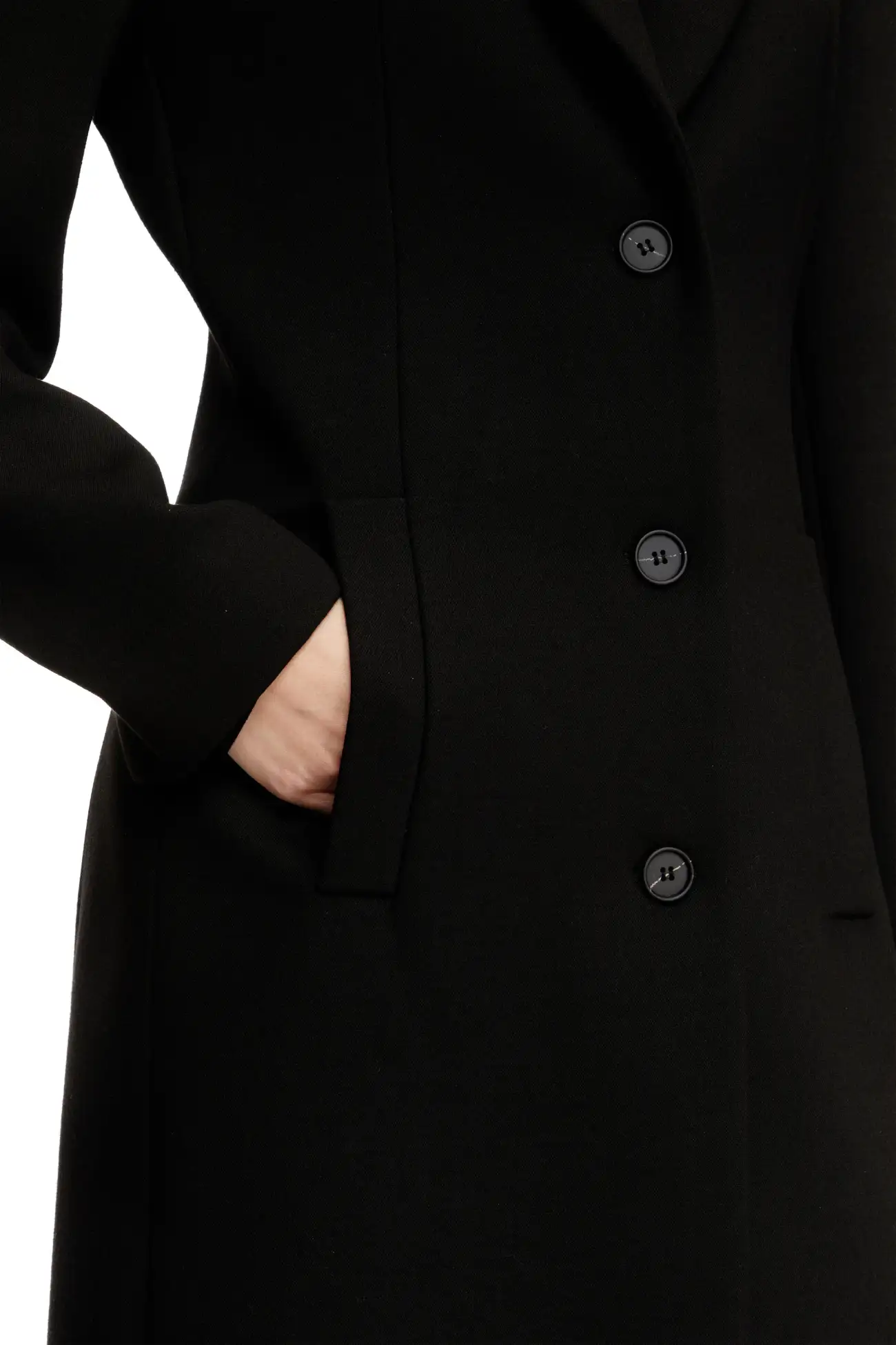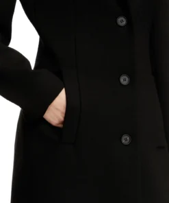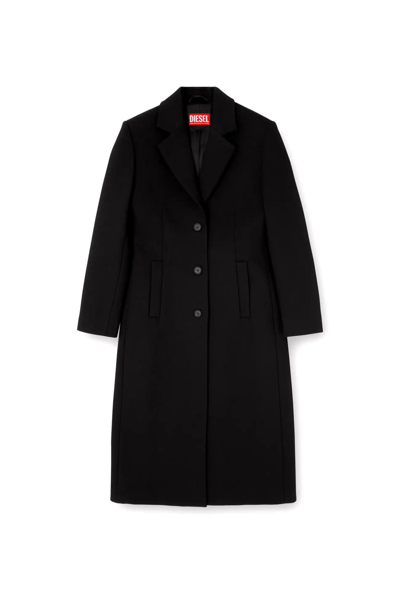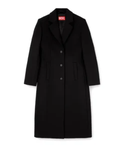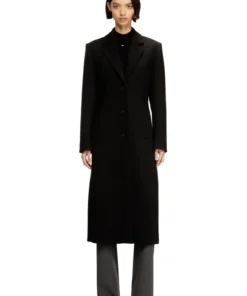 מעיל ארוך בגזרת שעון חול, בצבע שחור, מבד תערובת צמר מטופל בקווים נקיים ואלגנטיים. מבנה חד עם מותן מודגשת וכתפיים מעודנות, בטנה פנימית למראה מוקפד ולבישה חלקה, ותג Oval D דיסקרטי בגב