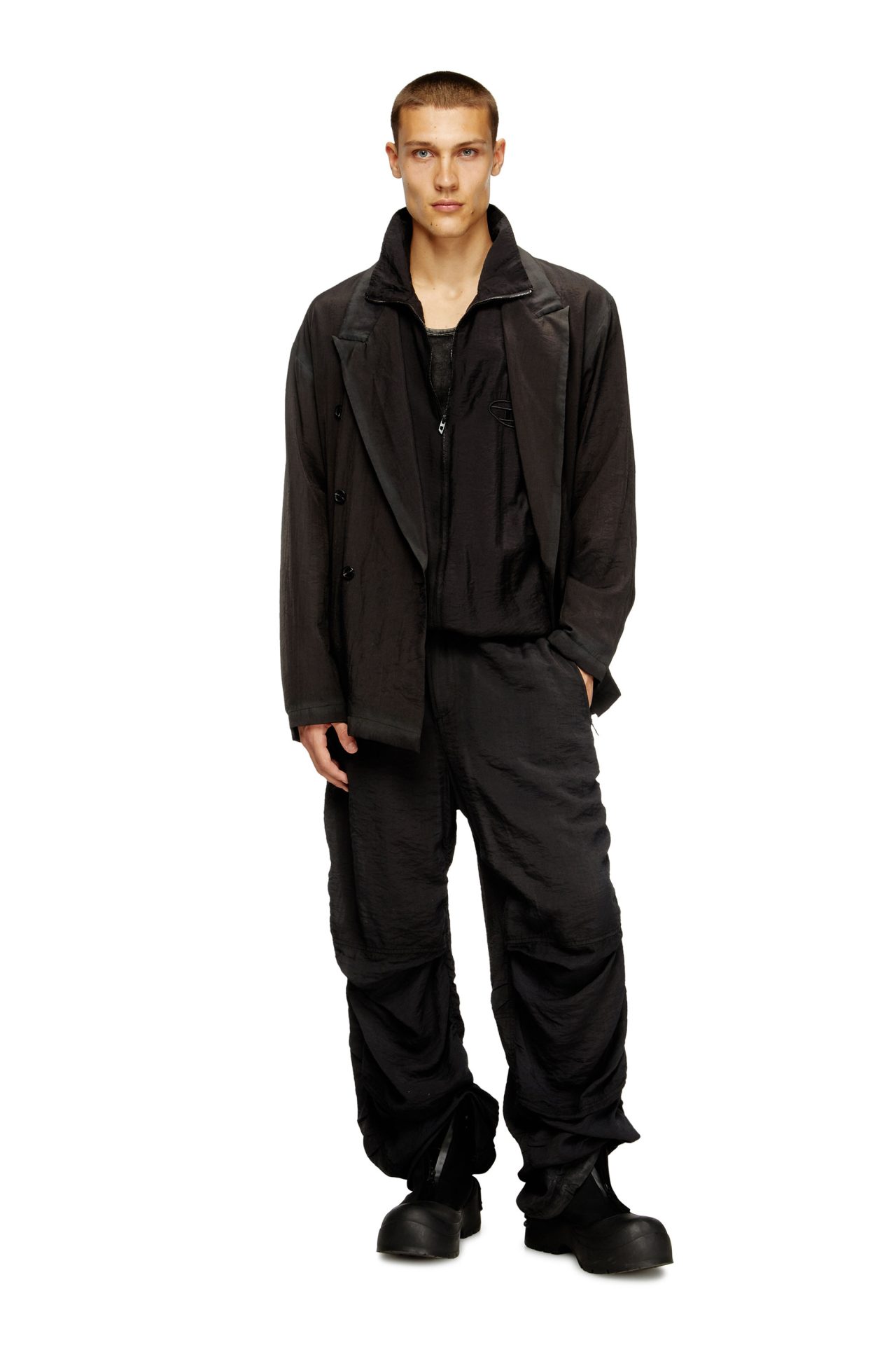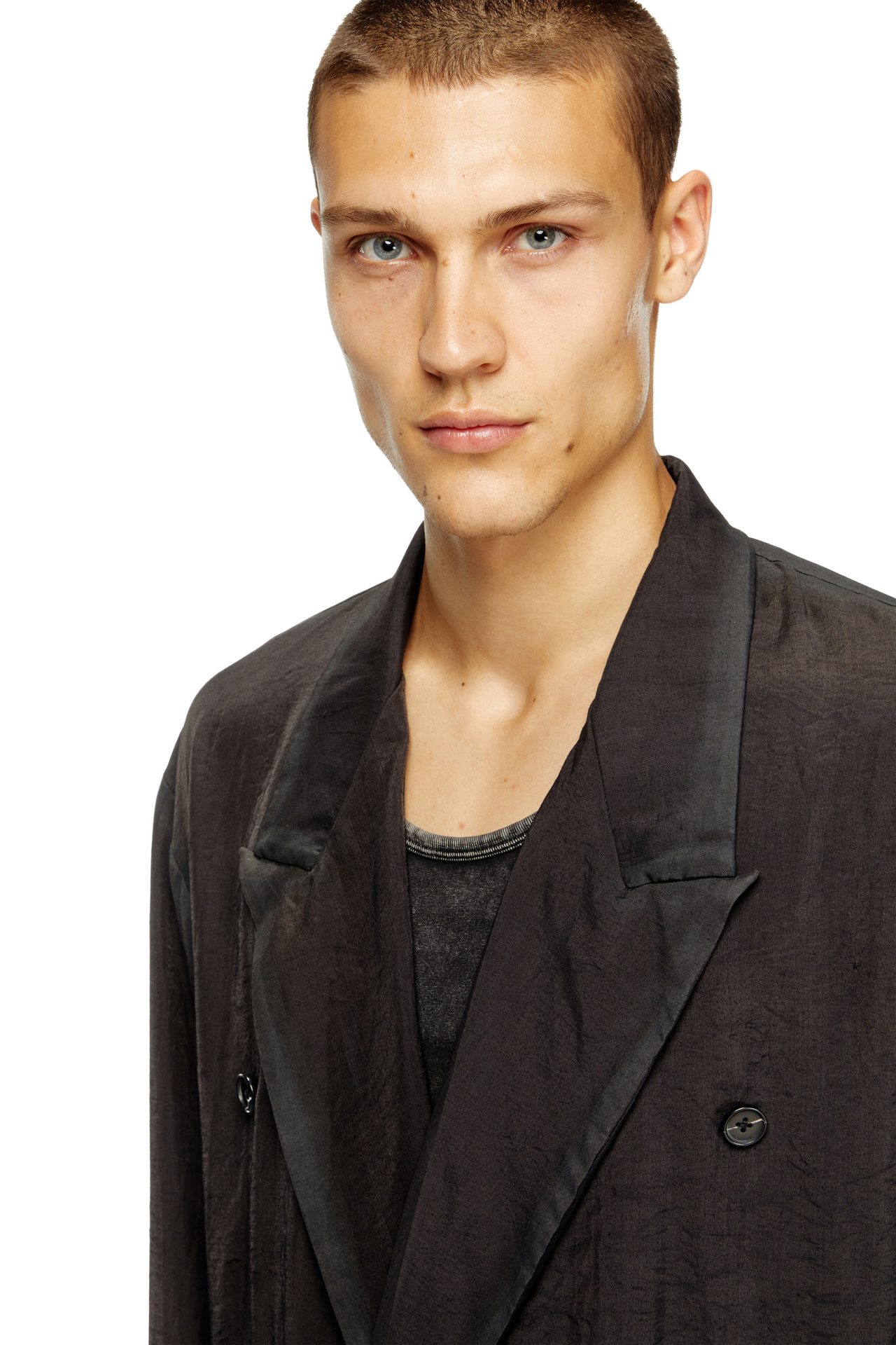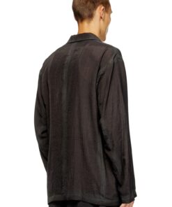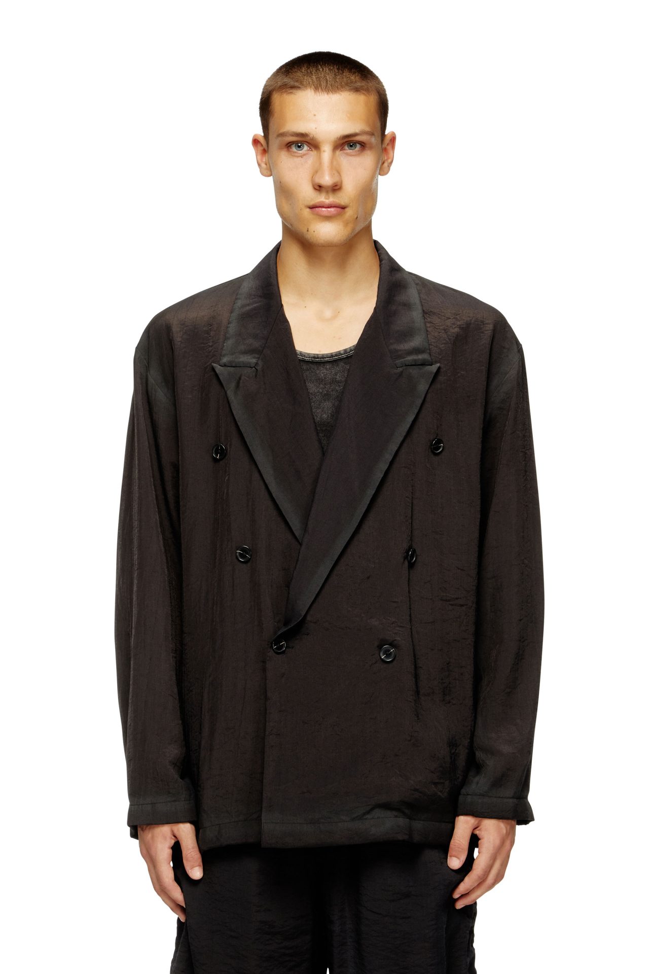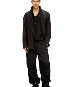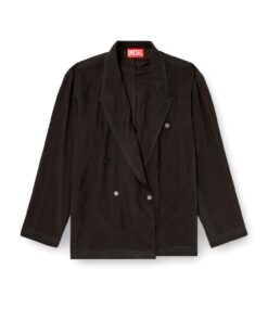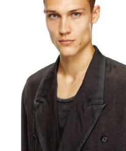 בלייזר שחור מבד ויסקוזה אקולוגי, שהוא הפרשנות של דיזל ללבוש פורמלי. קל במיוחד, עם טקסטורת קמטים עדינה ורכיסת כפתורים כפולה