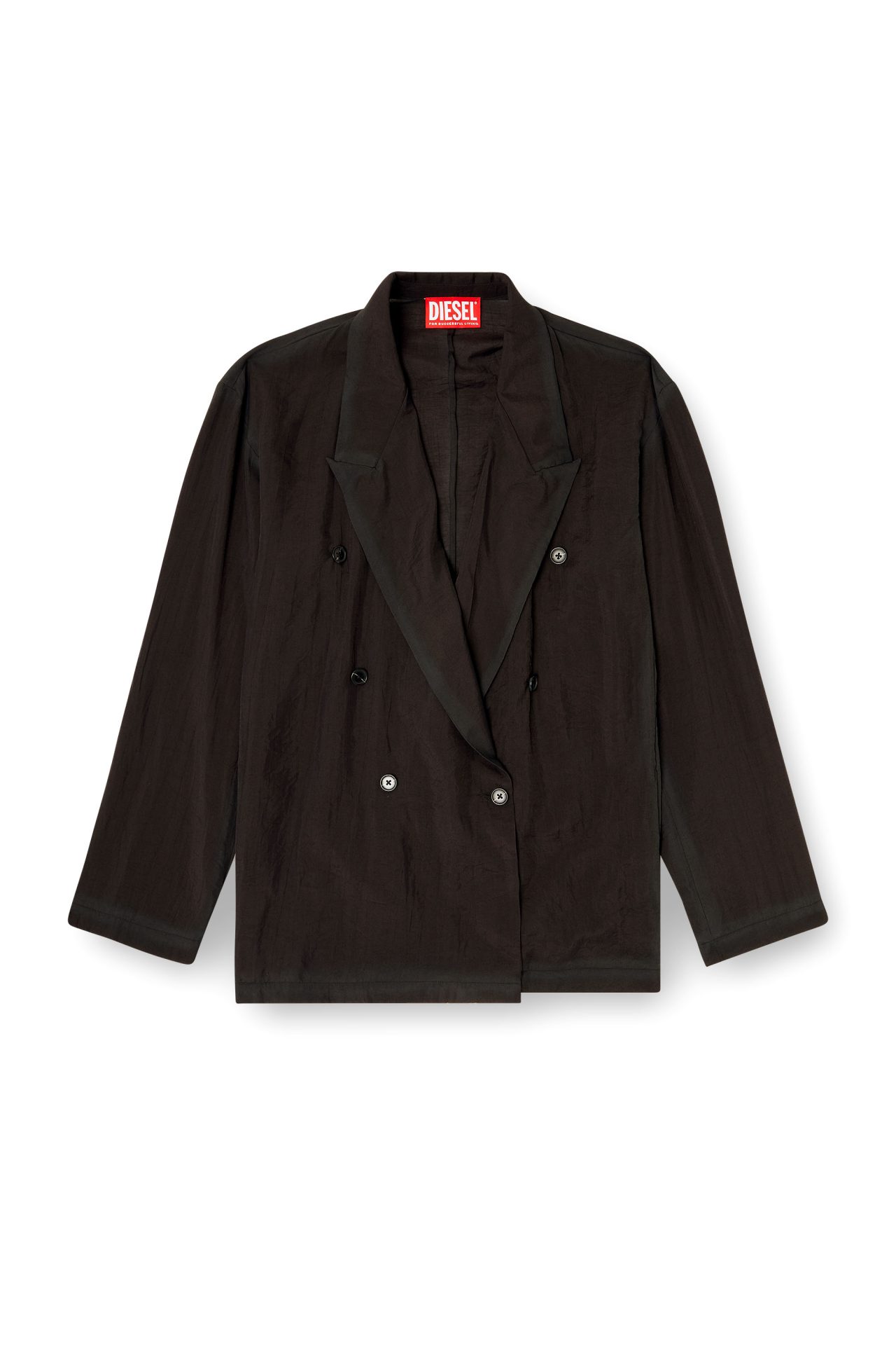 An unconventional take on formalwear, this men’s utilitarian blazer is rendered in ECOVERO™ viscose and nylon-blend fabric that’s ultralight, fluid and subtly crinkled. It's cut for a regular fit in a double-breasted profile and has a shell lining at the front. The treated finish makes it even more relaxed. Detailed with a metal logo plaque at the back.