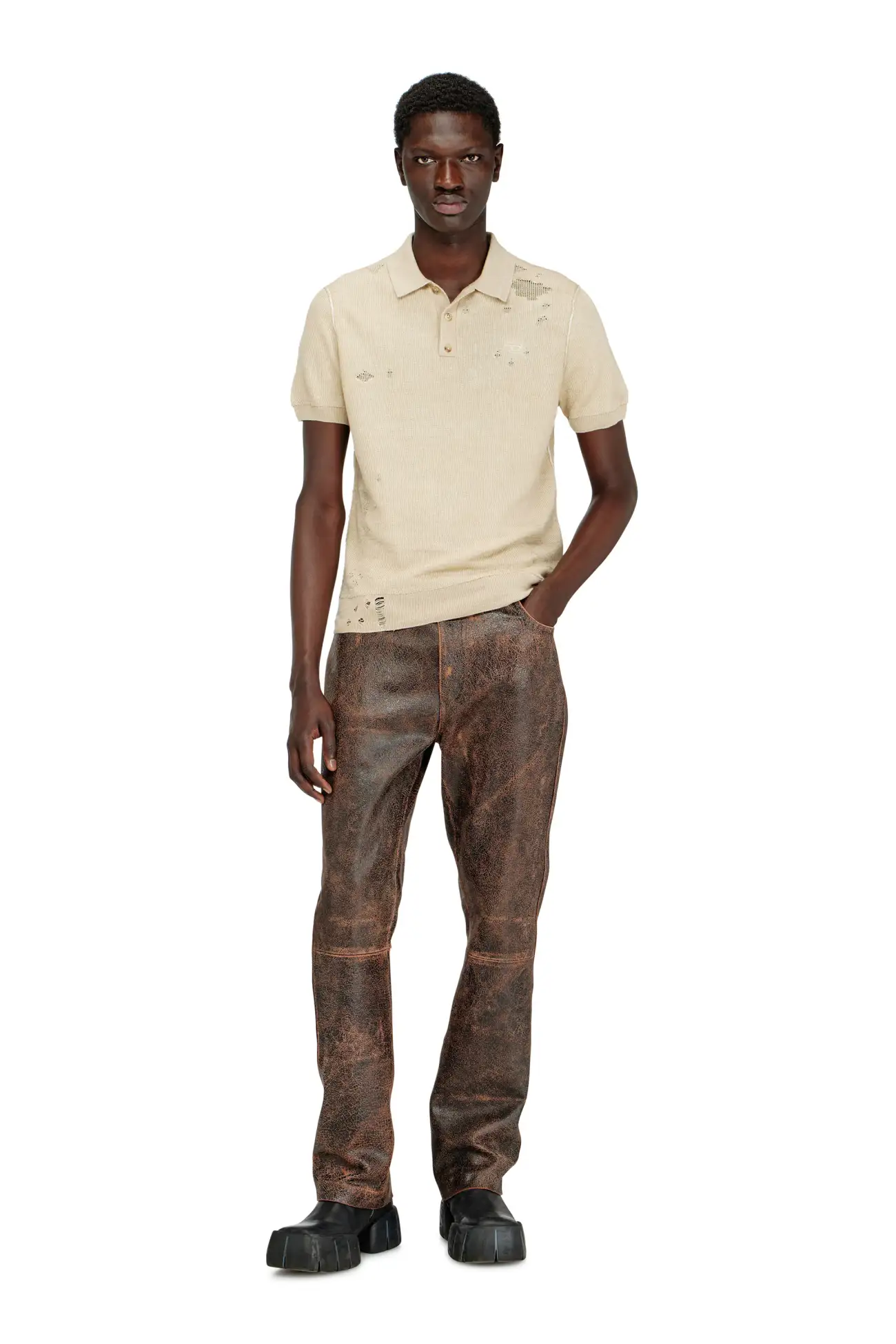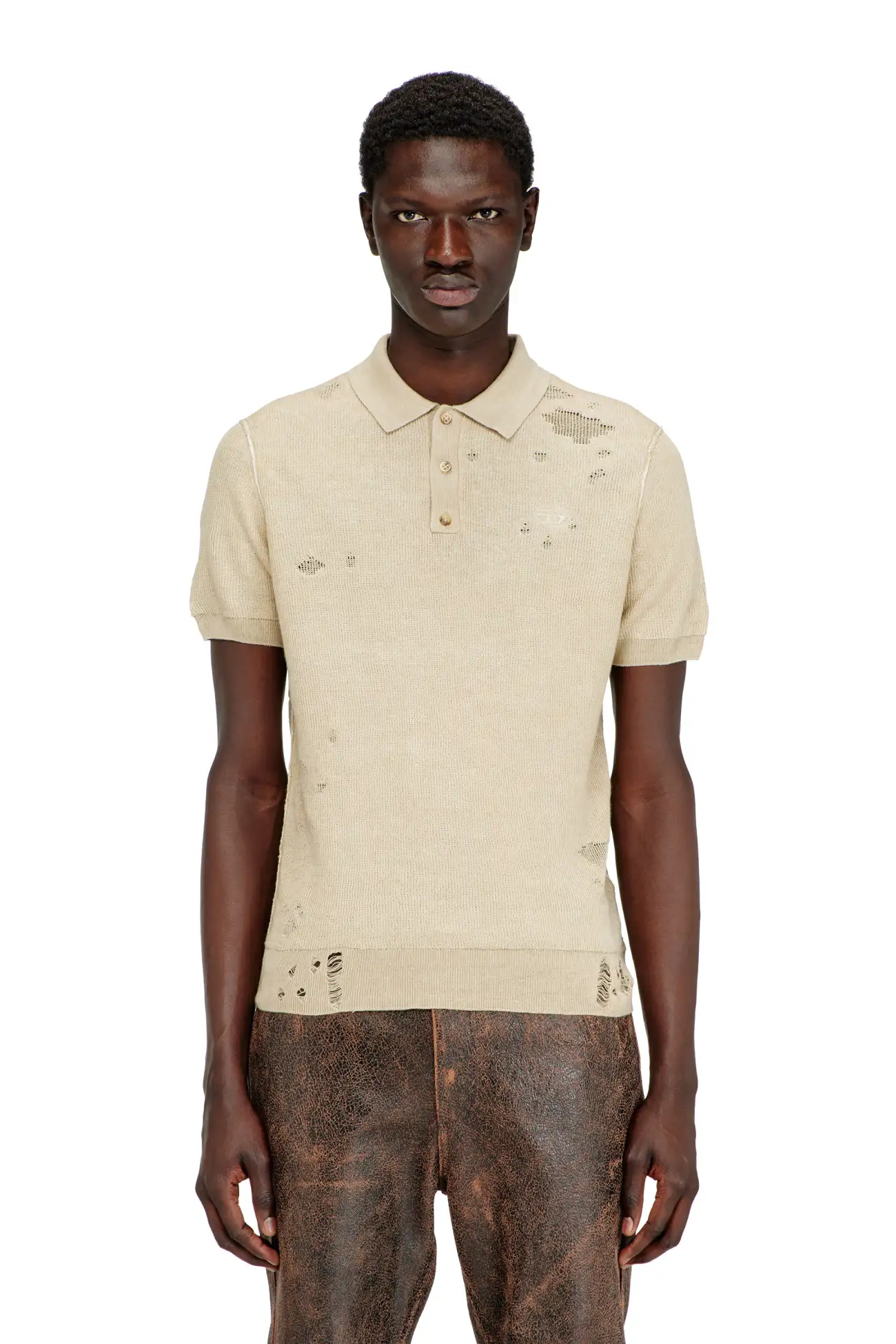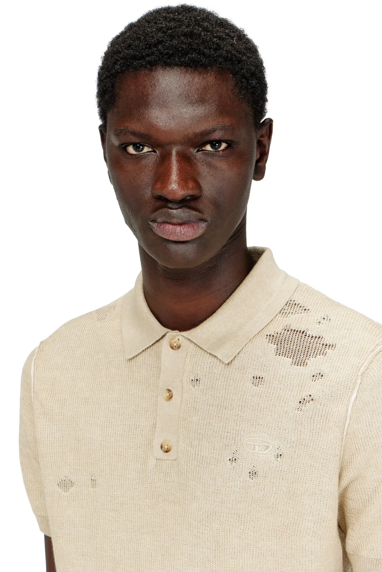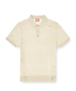 Short-sleeve knitted polo crafted from lightweight knit in a soft beige tone. The design features a classic polo collar with a short button placket and subtle distressed detailing that creates a worn, vintage-inspired look. A tonal Oval D logo embroidered on the chest adds a signature Diesel touch while maintaining a clean, minimal silhouette