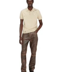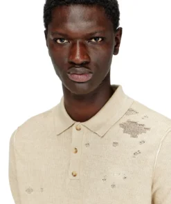 סריג פולו שרוול קצר עשוי סריג דק בגוון בז׳, בעיצוב נקי עם צווארון פולו וכפתרה קדמית. הפריט משלב אפקט קרעים עדין ופגמים מחושבים היוצרים מראה וינטג׳ שחוק. לוגו אובלי D רקום בחזה משלים את העיצוב במראה מינימליסטי עם DNA אופייני של דיזל