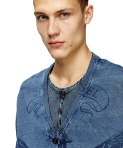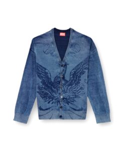 Men's blue cardigan with a V-neck and button closure. Comfortably oversized, this piece has been knitted from organic cotton, dyed in real indigo and treated to recall the iconic look of stonewashed denim. Laser technology is applied to the front, giving rise to the Phoenix logo graphic.