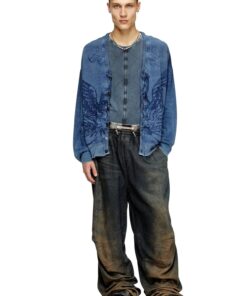 קרדיגן כחול עם מחשוף V וסגירת כפתורים, בגזרת אוברסייז. הסריג עשוי כותנה אורגנית שנצבעה באינדיגו אמיתי, עם טיפול המדמה את המראה של דנים שטוף באבן. הדפס לוגו פניקס נצרב בלייזר על החזית