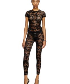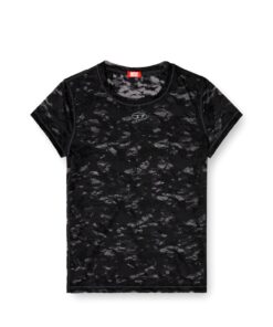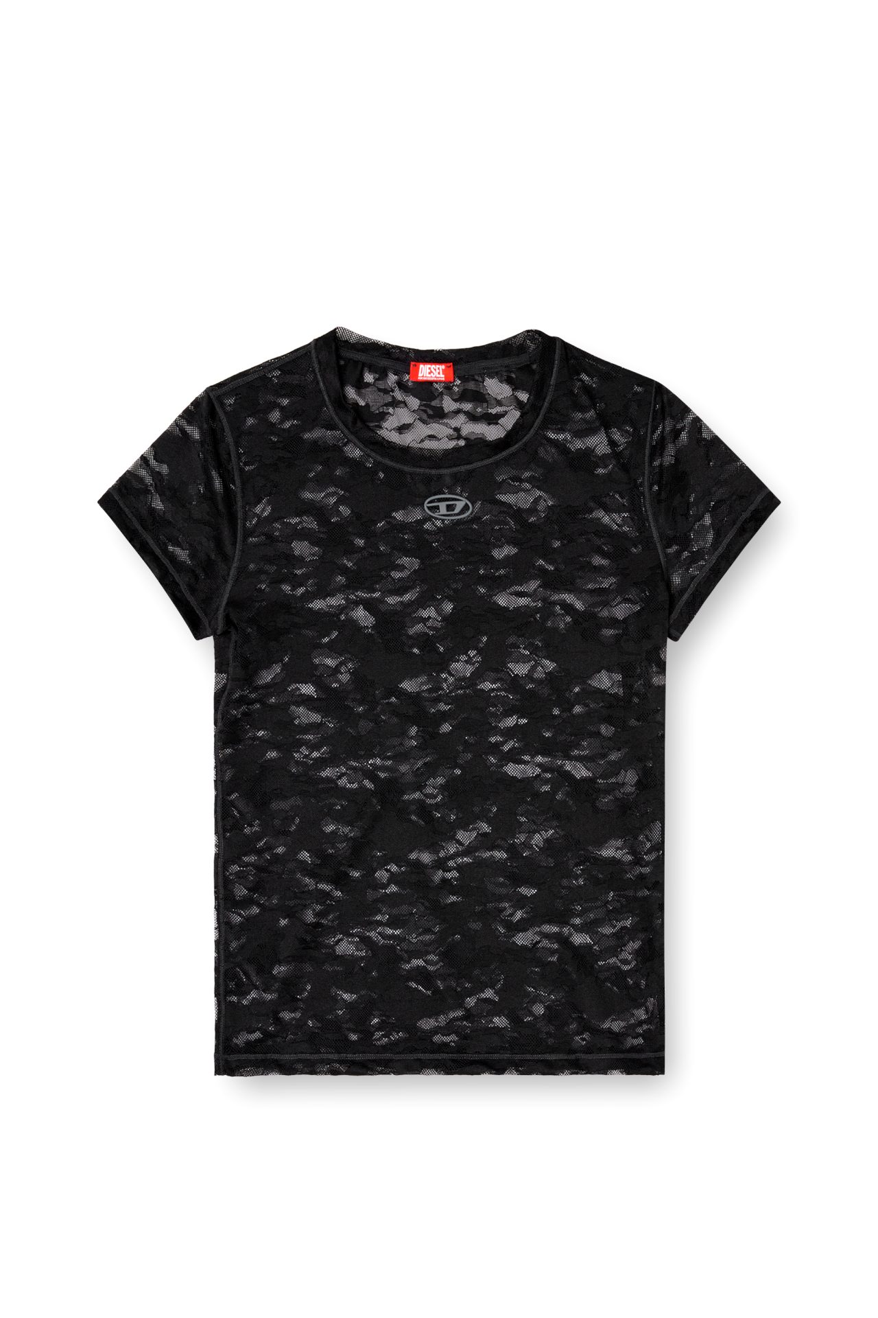 חולצת טי קצרה בצבע שחור מבד תחרה אלסטי בדוגמת הסוואה, עם רקמת לוגו