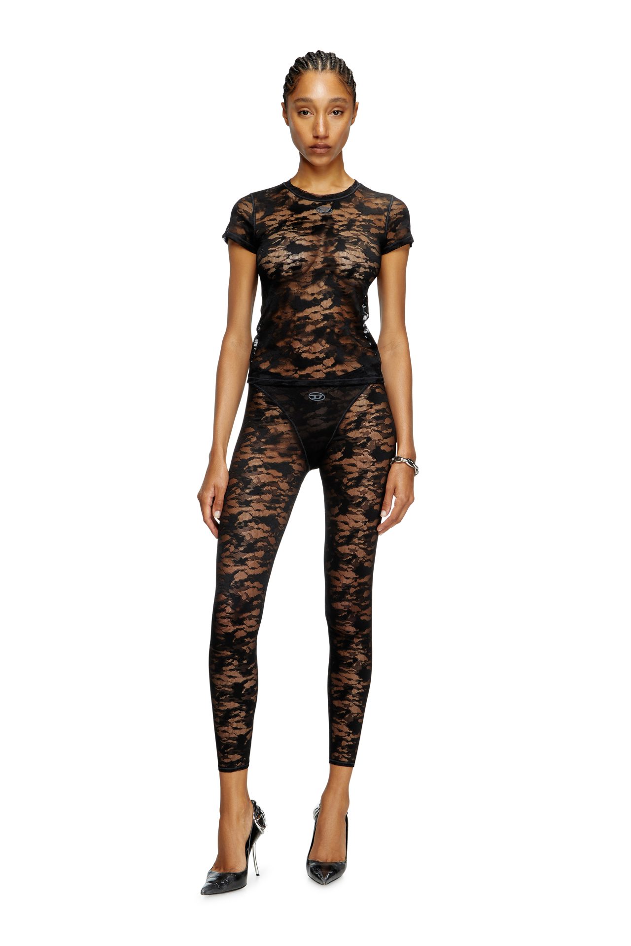 Women's lingerie top with cap sleeves, crafted from soft stretch lace with a utilitarian camouflage pattern. A tonal Oval D logo adorns the front.
