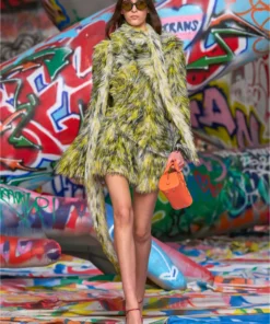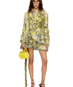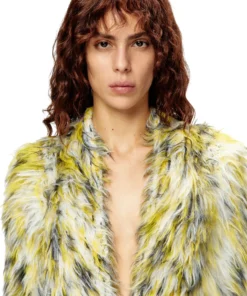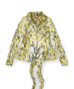 פריט מקולקציית המסלול של דיזל – קרדיגן פרוותי ורך בגזרת אוברסייז פתוחה עם אפשרות לדרכים שונות של עטיפה או קשירה, עשוי תערובת סיבים סינתטיים וצמר מוהייר בגוונים ניטרליים עם נגיעות של צהוב ניאון
