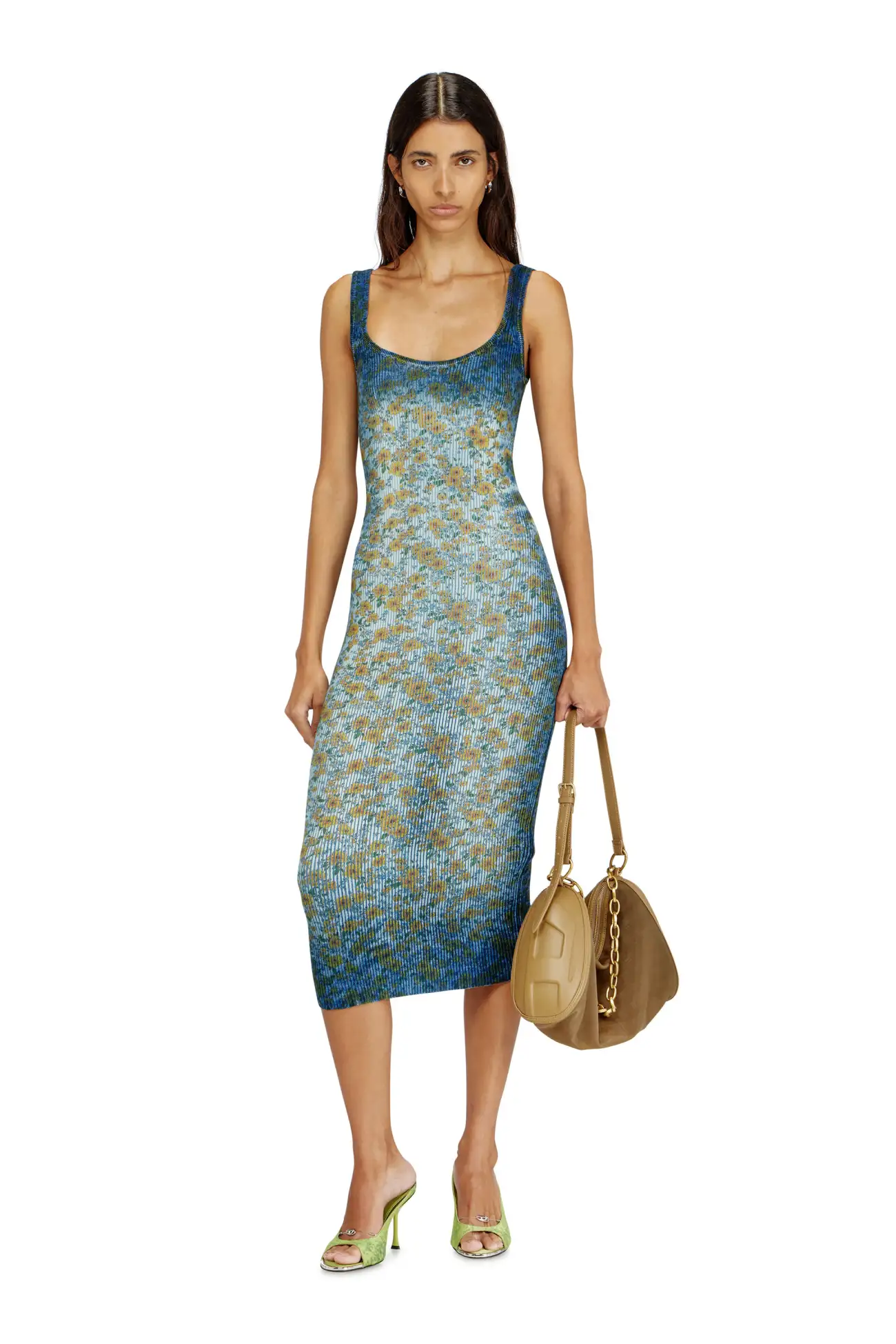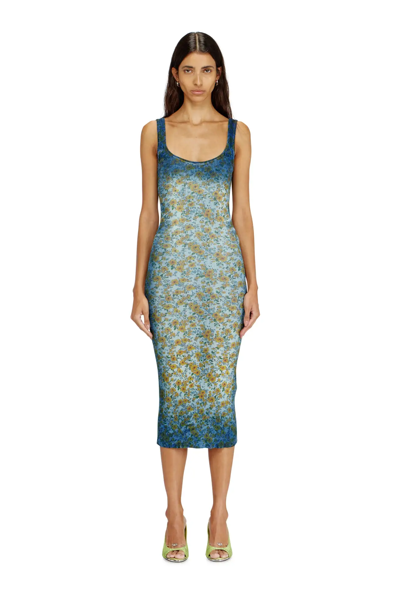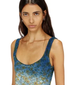 A subversion of classic patterns and narratives, this women’s midi dress from the SS26 Runway Show appears X-rayed, as though its floral pattern has been revealed from within. The ribbed organic cotton knit is dyed indigo blue — a nod to Diesel’s denim DNA — then specially treated and printed to create a cool, spectral experiment on a body-skimming tank silhouette.