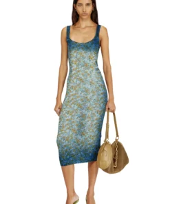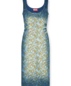 פריט מקולקציית המסלול של דיזל, שמלת מידי לנשים בסריג כותנה אורגנית צבוע אינדיגו עם הדפס פרח אפקט רנטגן. הסילואטה הצמודה לגוף בסגנון גופייה מודגשת בטיפול והדפס המדגישים את אפקט הדנים האייקוני.