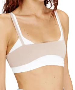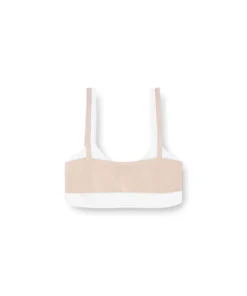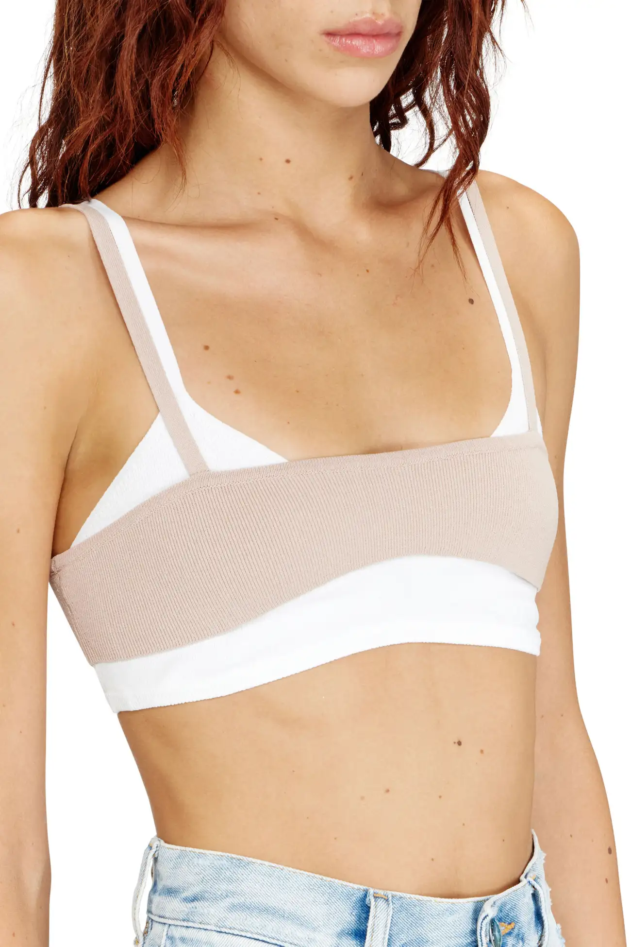 טופ חזייה סרוג בגוון ורוד/לבן בעיצוב שכבות המדמה שתי חזיות במבנה אחד. פאנלי ריב בניגוד צבע יוצרים מבנה מחוטב ולוחית אובל D מתכתית בגב משלימה את הפריט.
