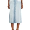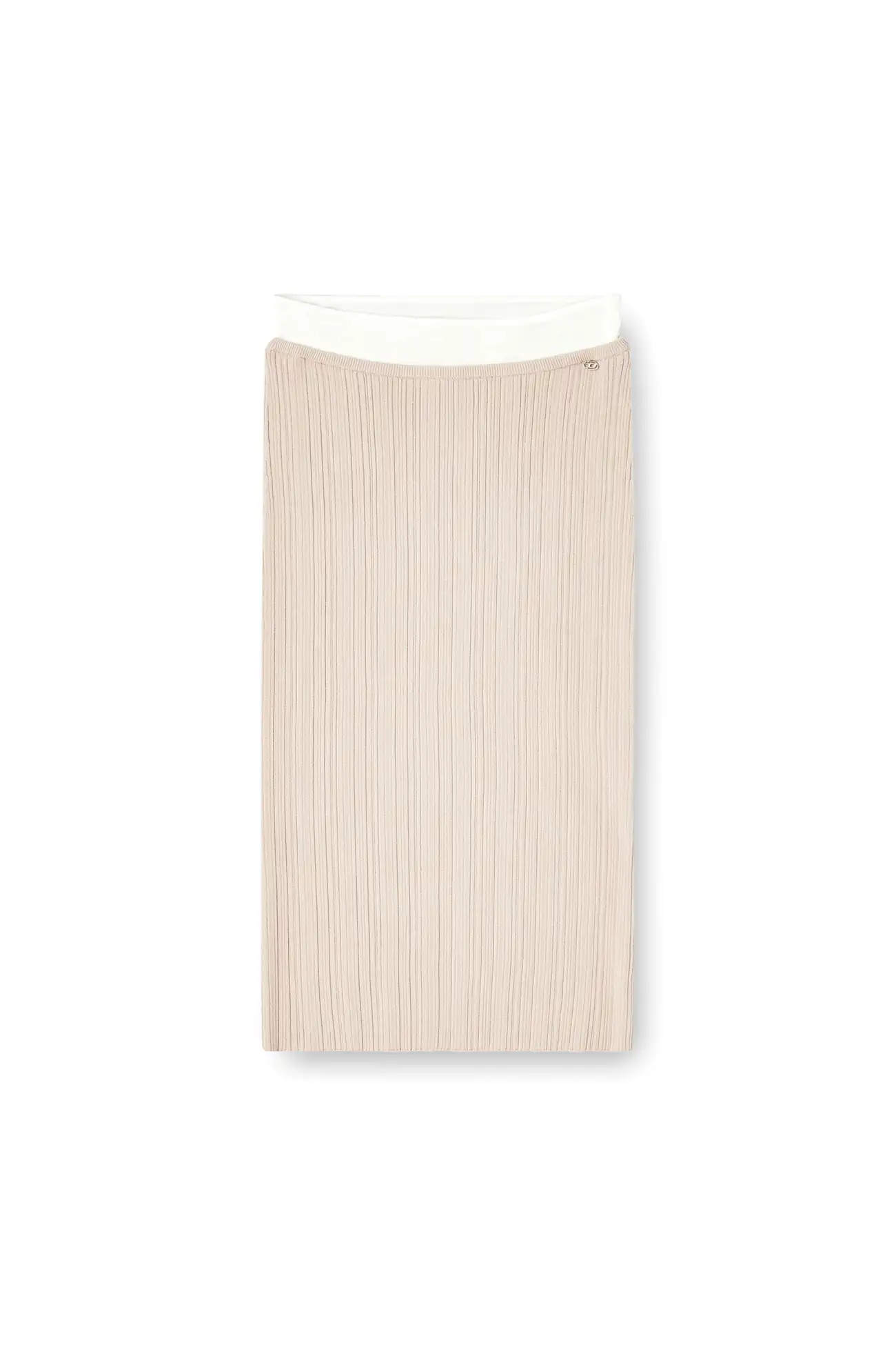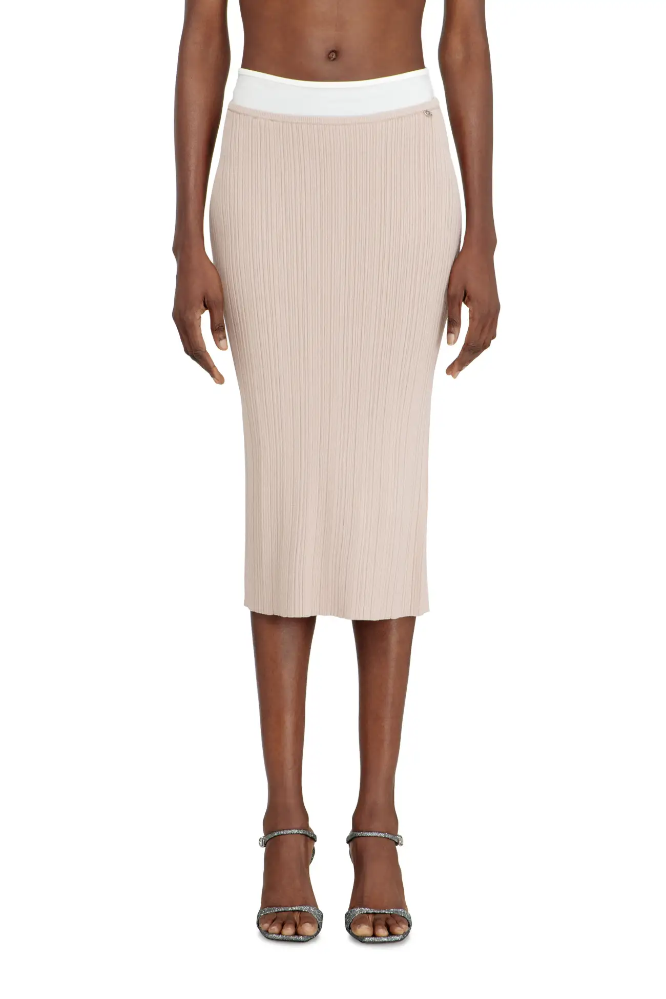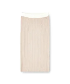 Women's midi skirt in viscose yarn, knitted in varying rib ratios for a tactile look and feel. The midi length and vertical rib texture highlight the shape of the body, while the stretchy fabric offers a comfortable fir. A contrasting waistband completes the look.