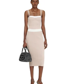 חצאית מידי סרוגה בגוון ורוד עשויה חוט ויסקוזה במבנה ריב משתנה. המרקם האנכי מדגיש את קווי הגוף וחגורת מותן ניגודית משלימה את העיצוב.