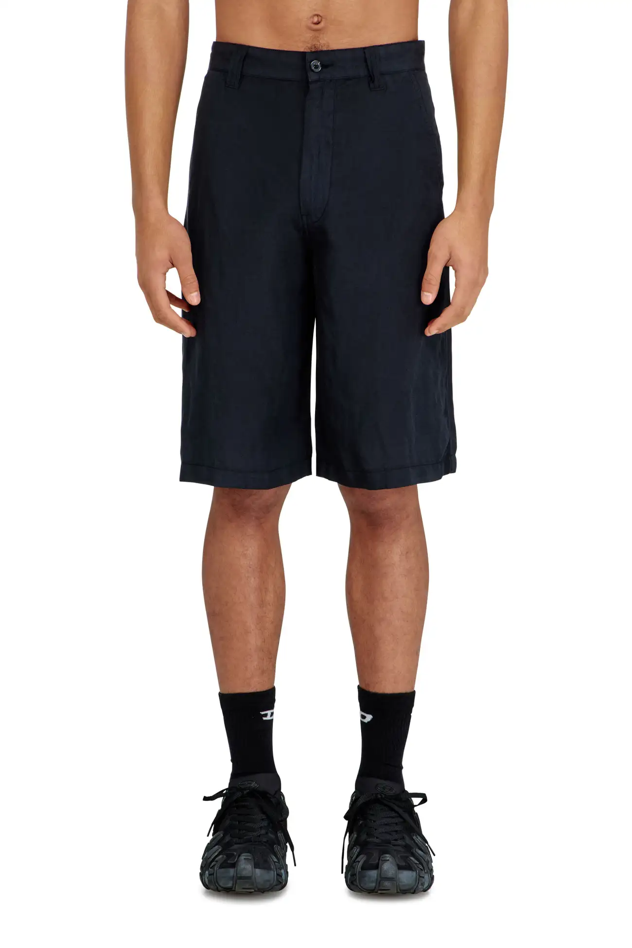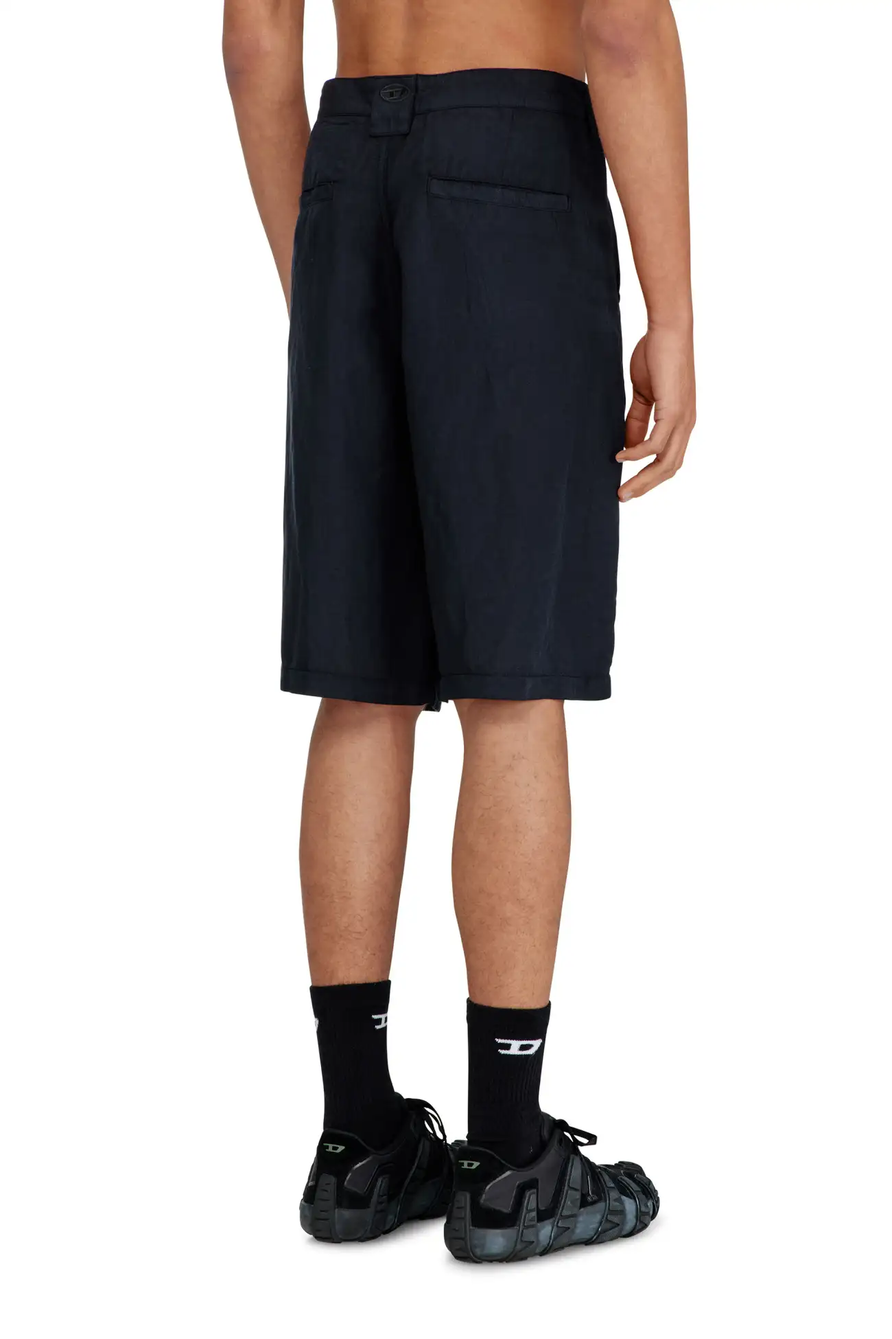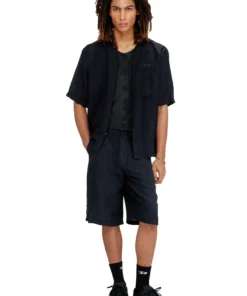 מכנסי ברמודה מתערובת מודל, ויסקוזה ופשתן בצבע שחור בגימור גארמנט-דיי למראה רך, מעוצבים עם כיסים קדמיים וכיס פס בגב ורקמת לוגו אובלית טונאלית בלולאה האחורית