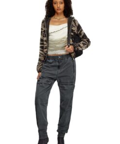 מכנסי דגמ״ח בצבע אפור כהה מבד אריג עם כיסים גדולים על הברכיים, סגירת כפתורים וגומי במותניים ובקרסוליים