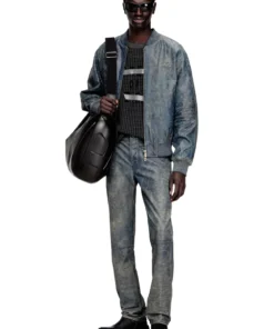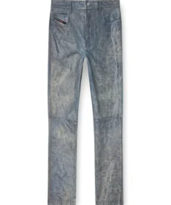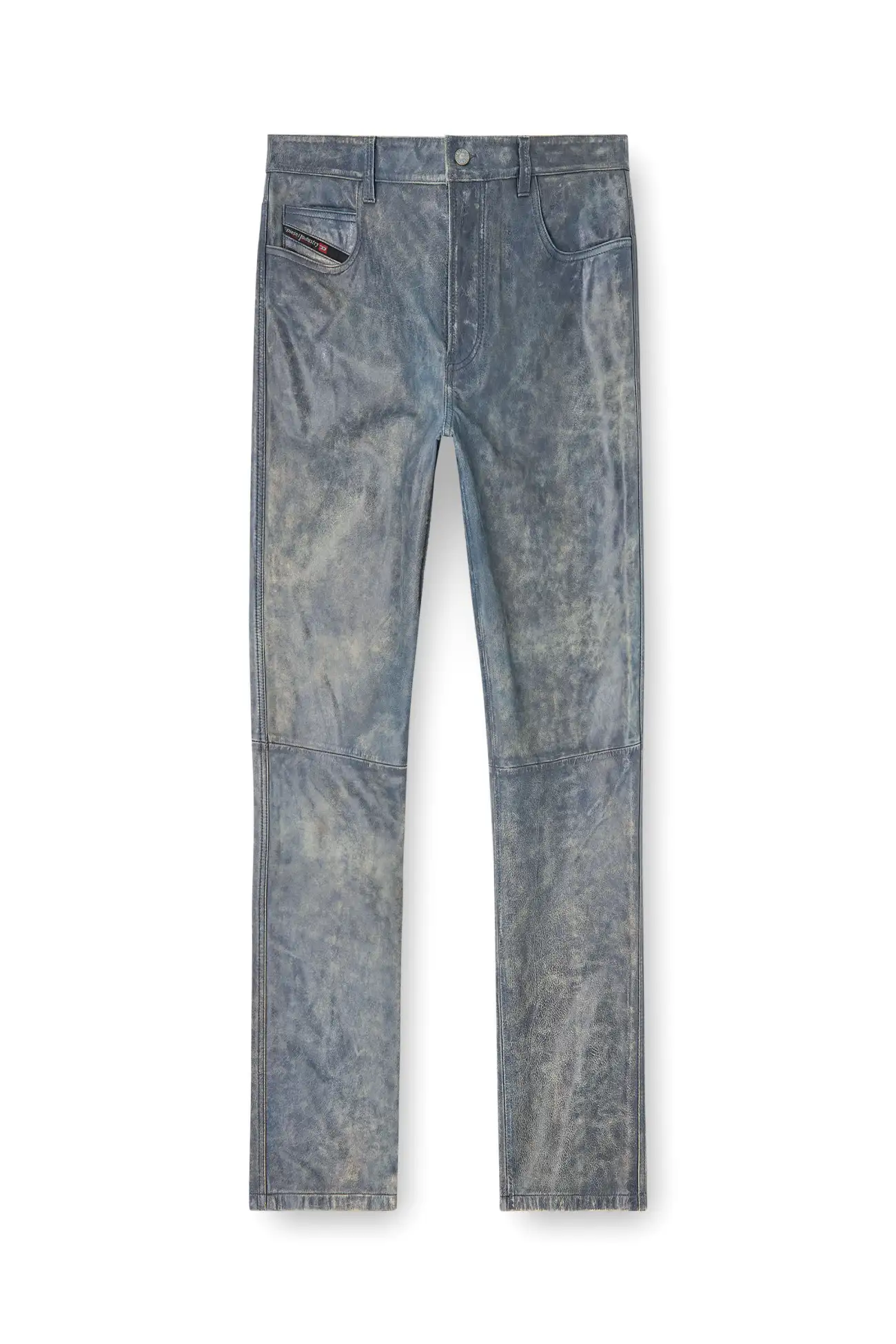 מכנסי עור לגברים בגוון כחול במבנה ג׳ינס קלאסי עם חמישה כיסים וסגירת כפתורים. העור עבר שטיפה וטיפול ידני ליצירת מראה דהוי בהשראת דנים.