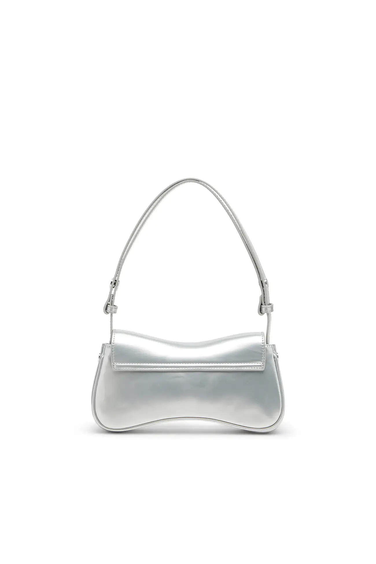 תיק מטאלי לנשים בצבע כסף, בעיצוב Play האיקוני בהשראת שלטי משחק, עשוי PU מבריק עם סגירת דש ועיטור די אובאלית מתכתית תואמת, לנשיאה ביד או עם רצועה