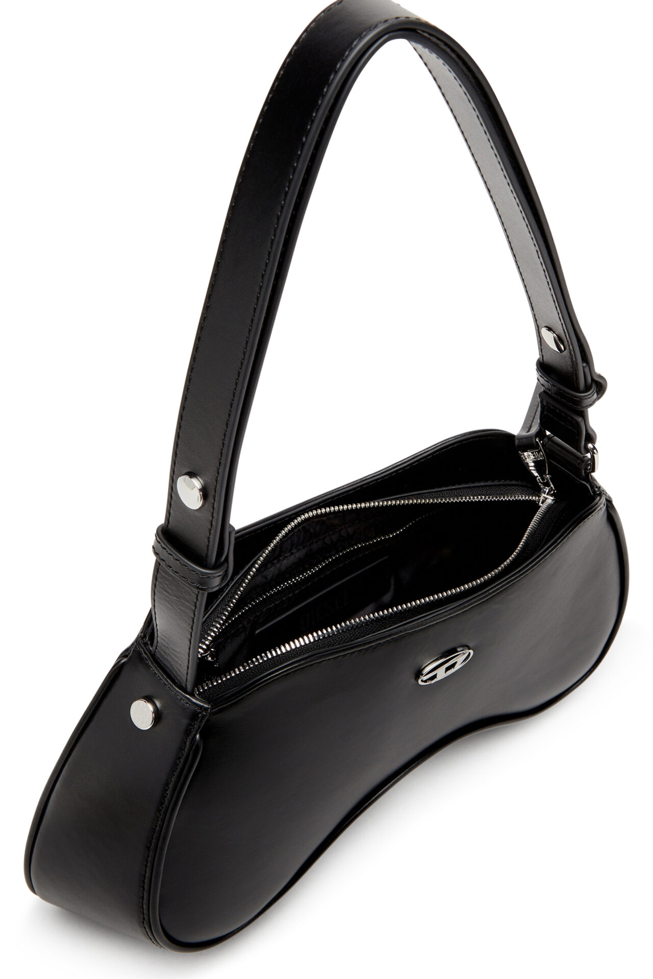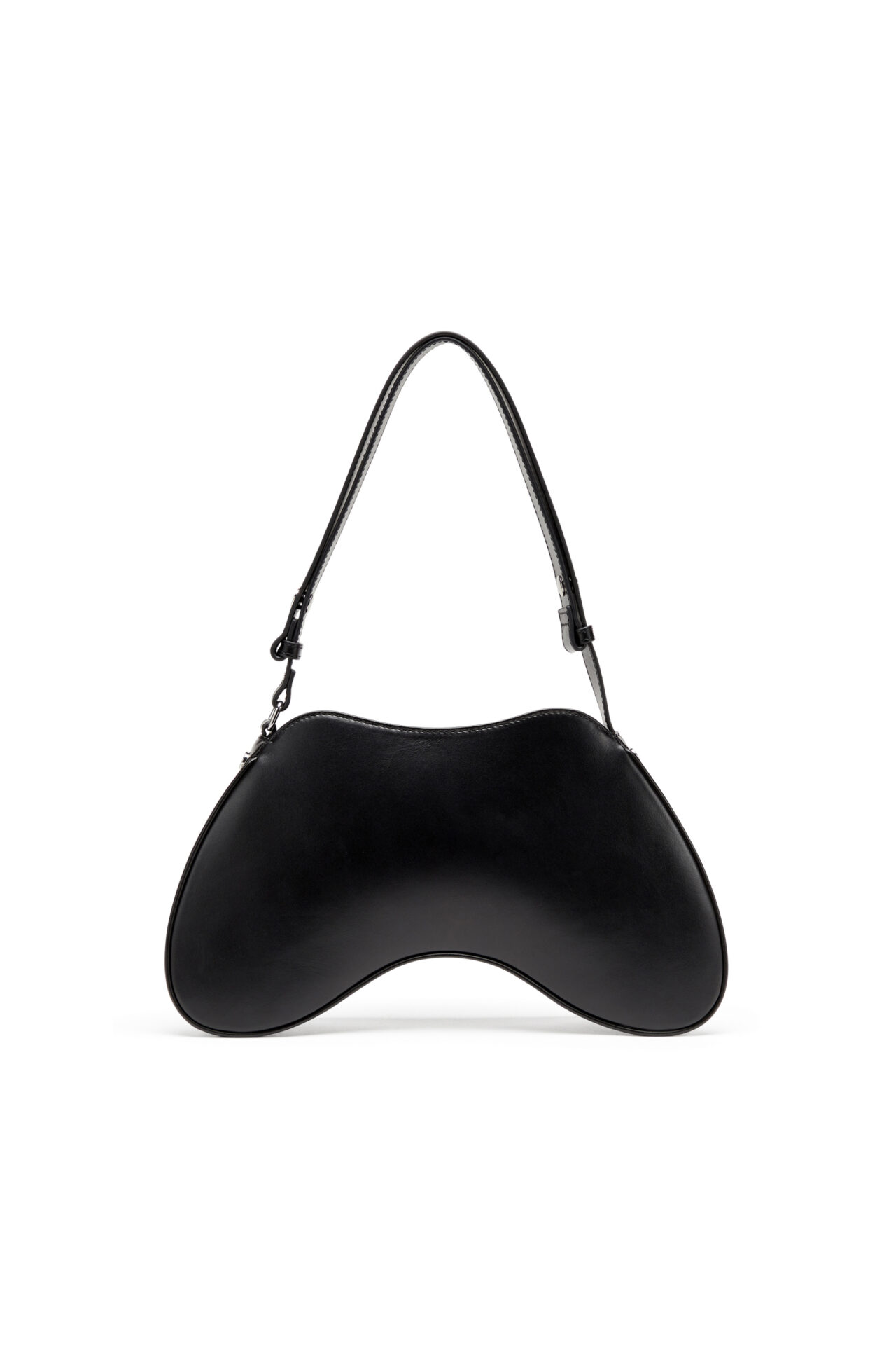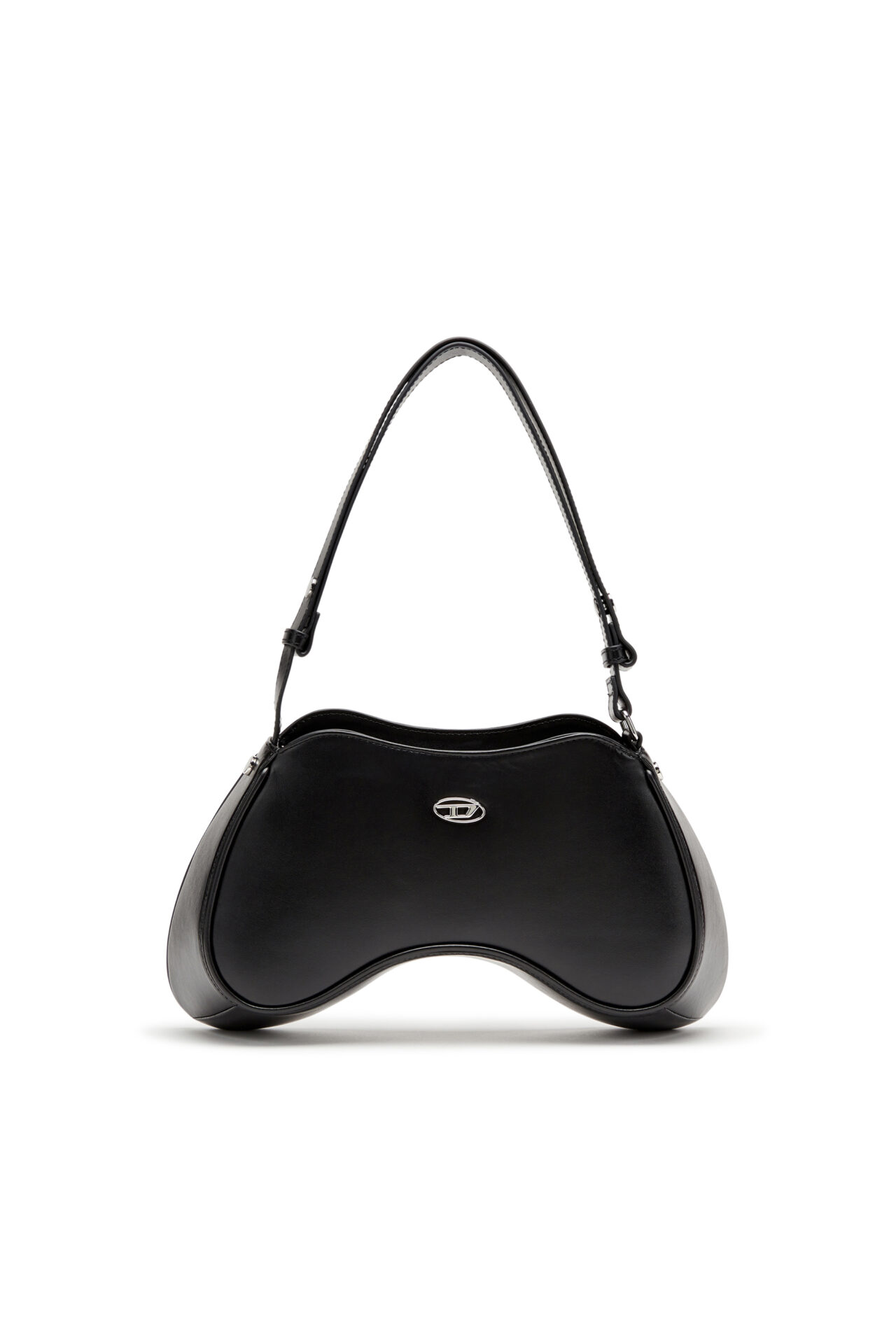 Sleek and playful, this women's shoulder bag is characterised by a sinuous shape inspired by gaming controllers. It's crafted from smooth leather with a semi-gloss finish, embellished by shiny Oval D hardware and fastened with a zipper at the top. The shoulder strap is adjustable to customise the drop.