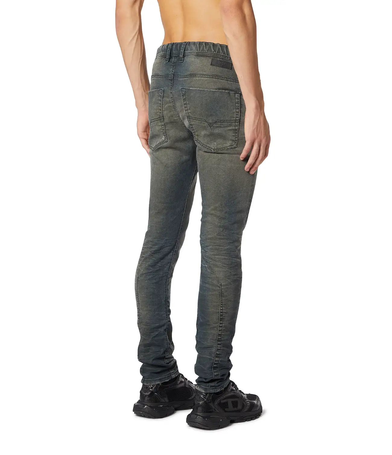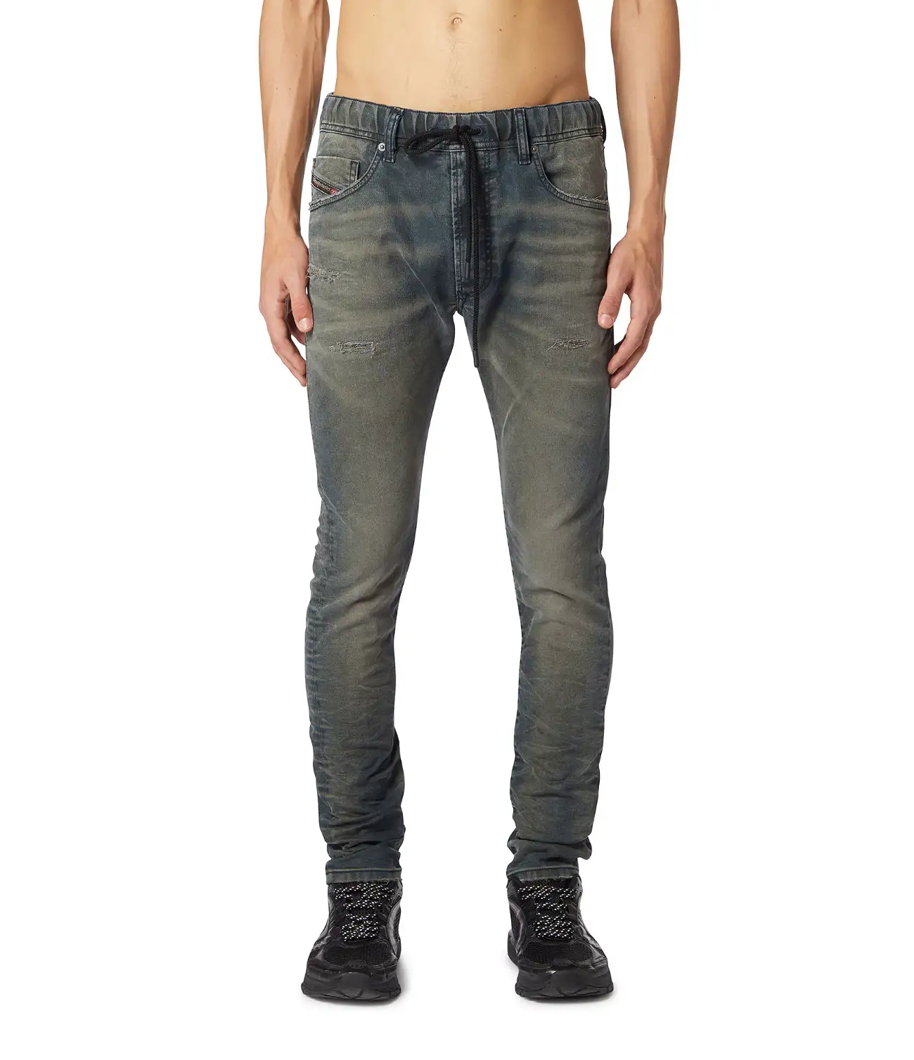 ג׳וג ג׳ינס בגזרה רגילה בצבע כחול כהה עם מותן בינונית ורגל מתחדדת, עשויים בד JoggJeans לנוחות גבוהה, עם מותן אלסטית וקפל מאחור באזור השוק