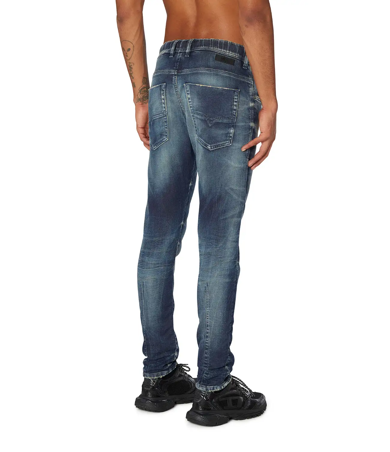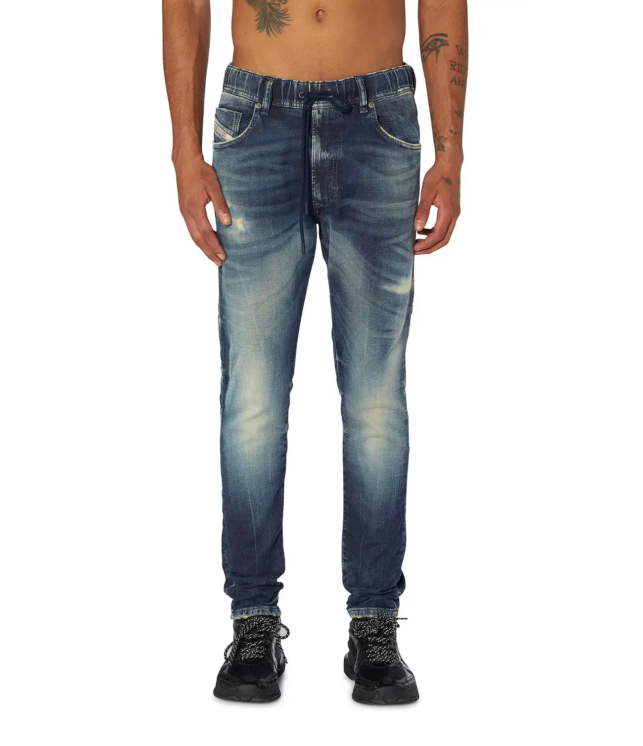 ג׳וג ג׳ינס בגזרה רגילה בצבע כחול כהה עם מותן בינונית ורגל מתחדדת, עשויים בד JoggJeans לנוחות גבוהה, עם גומי מותן אלסטי וקפל מאחור באזור השוק