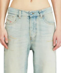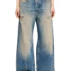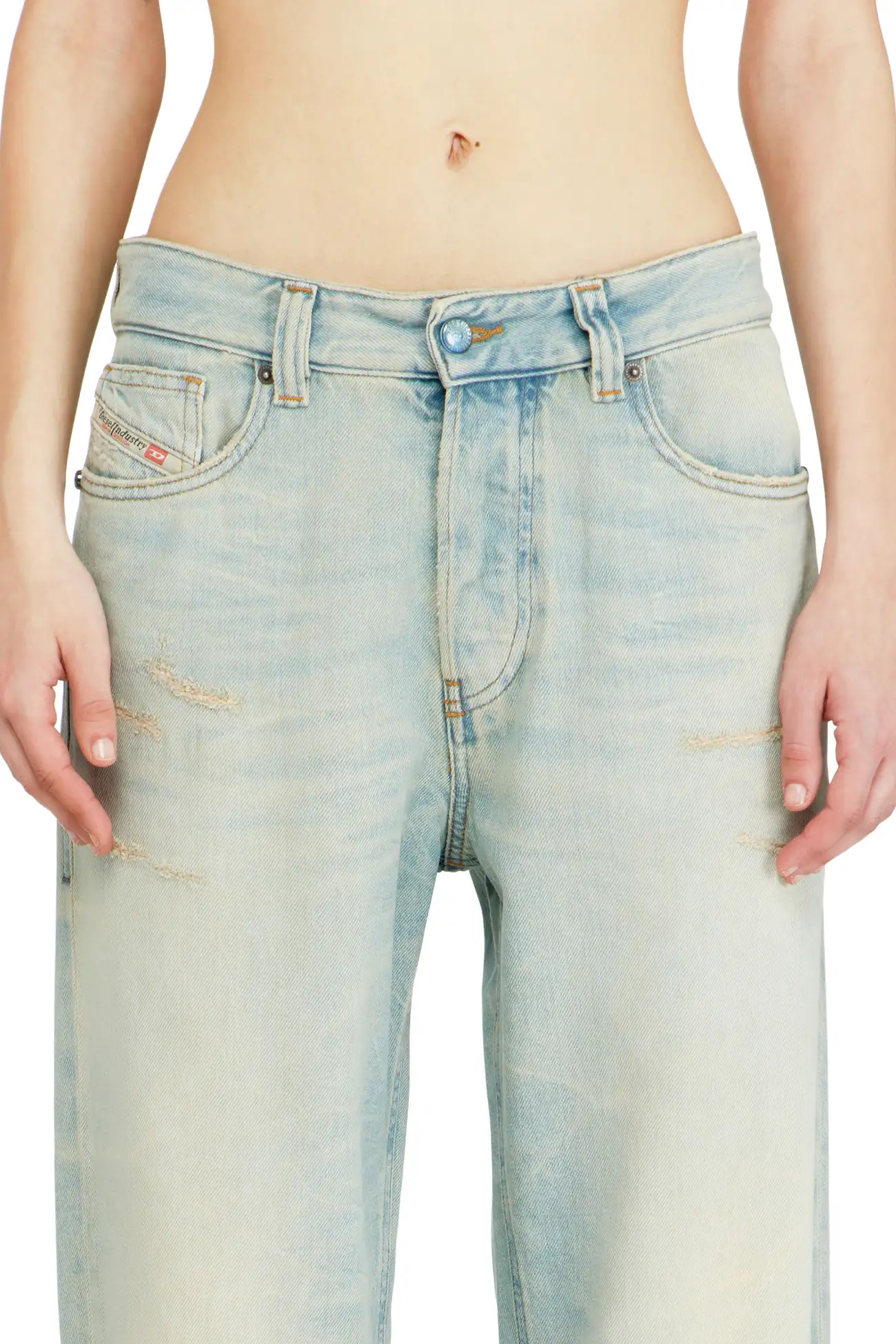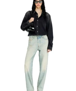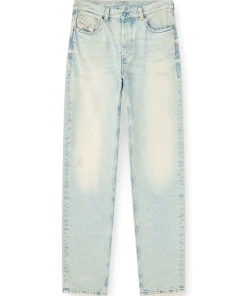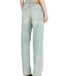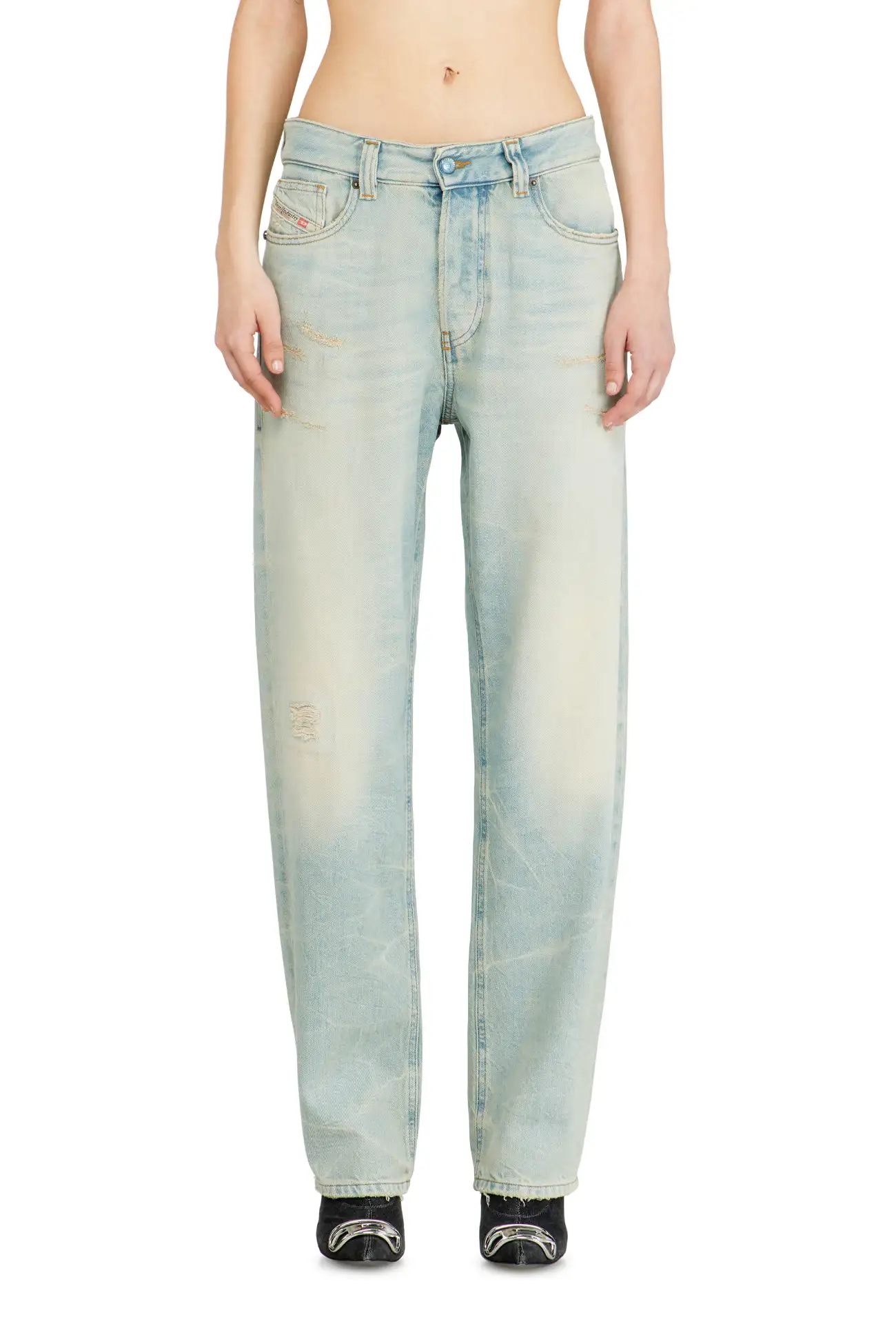 ג׳ינס בגזרה רפויה בצבע כחול בהיר עם מותן נמוכה ורגל ישרה, בעיצוב הכולל מותן חתוכה וכיסים עם גימור פרום