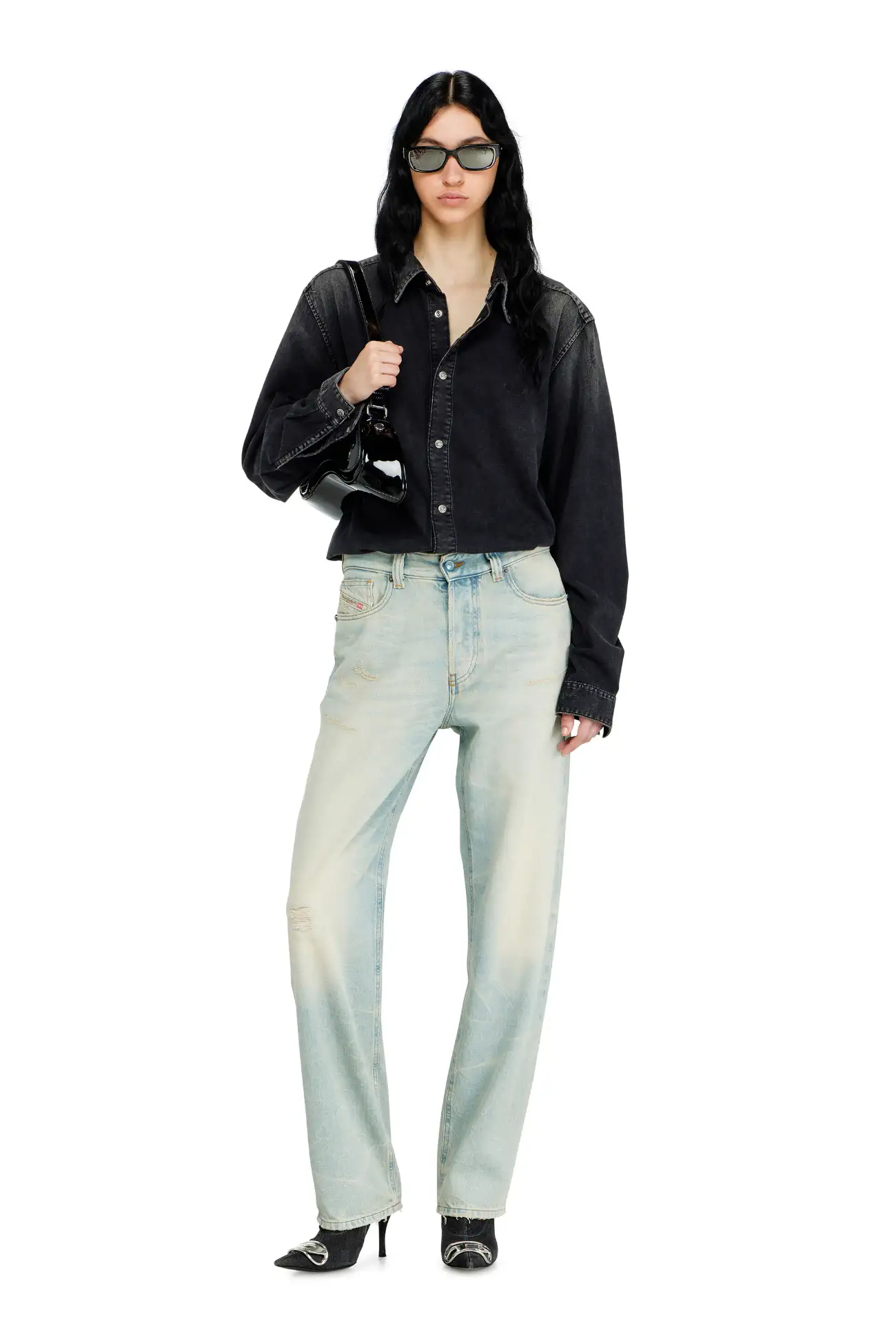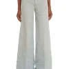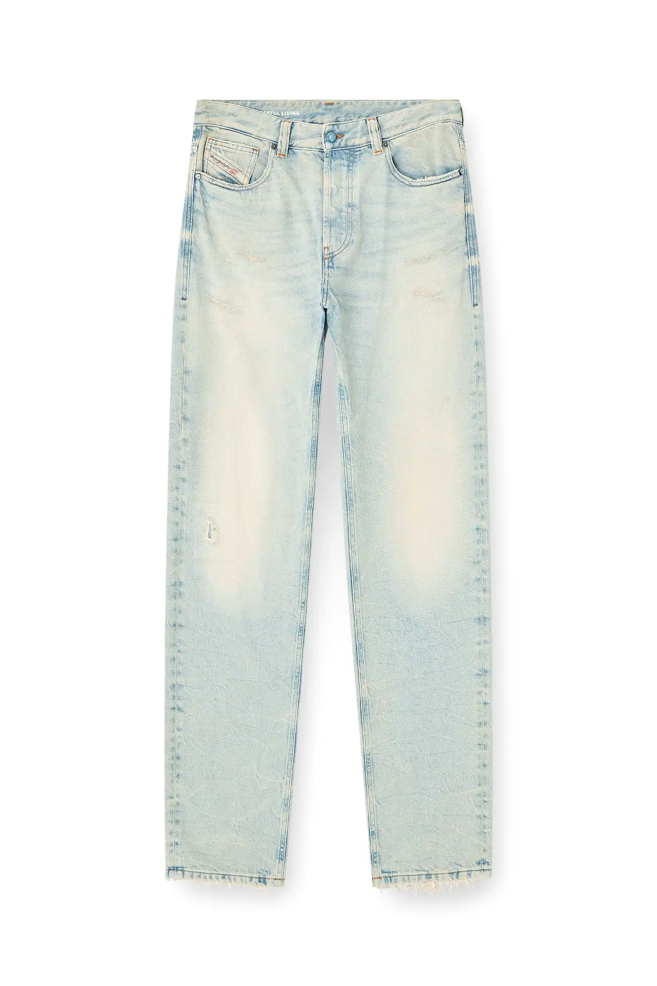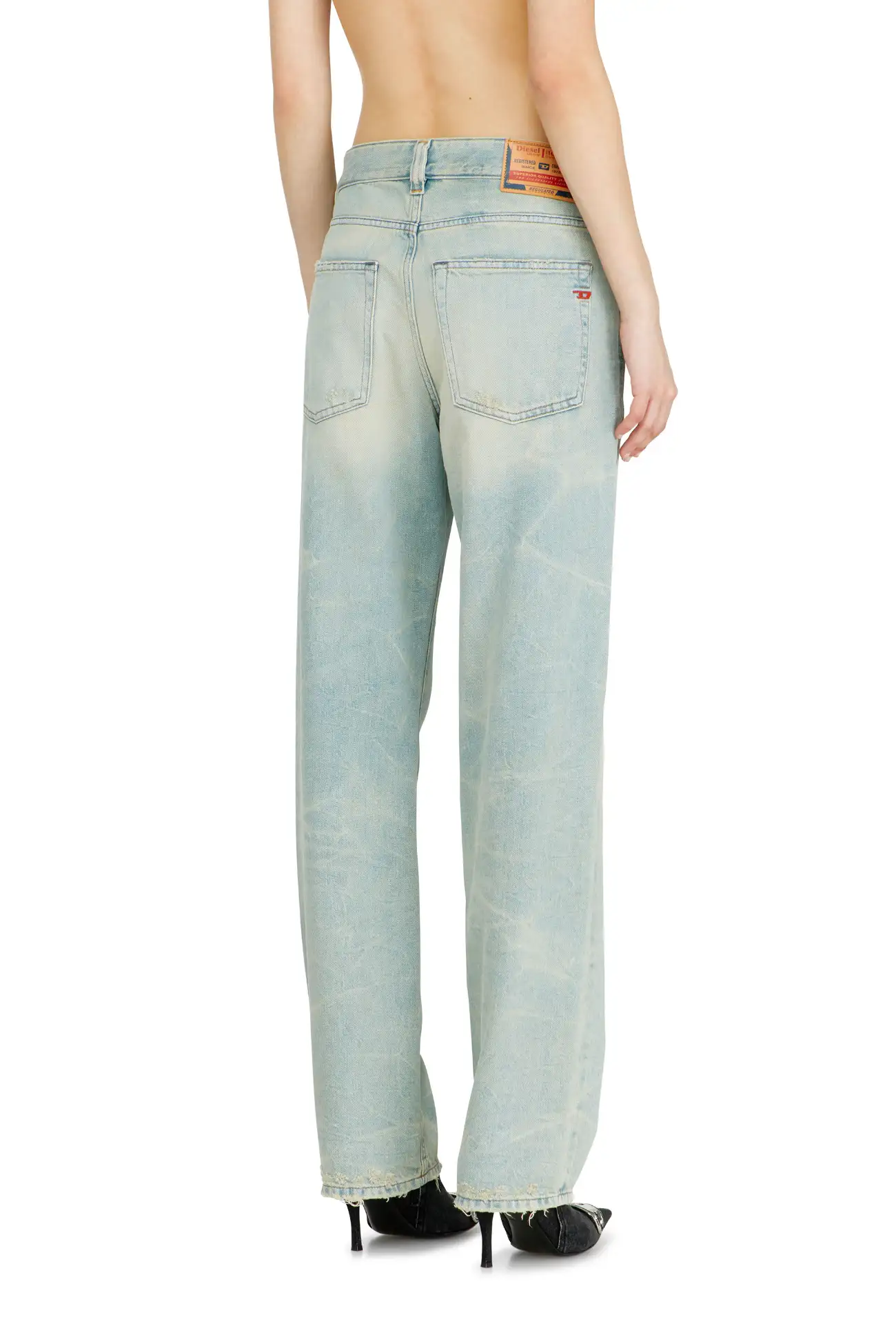 ג׳ינס בגזרה רפויה בצבע כחול בהיר עם מותן נמוכה ורגל ישרה, בעיצוב הכולל מותן חתוכה וכיסים עם גימור פרום