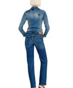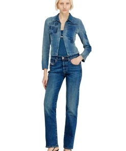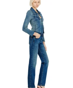 ג׳ינס בגזרה רגילה בצבע כחול כהה עם מותן נמוכה ורגל ישרה, בסגירת כפתורים, בהשראת סילואטות ארכיון משנות ה־90