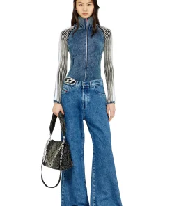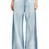ג׳ינס בגזרה רפויה בצבע כחול עם מותן נמוכה, מפשעה נמוכה ורגל רחבה במיוחד, בסילואטה אוברסייז דרמטית עם לוגו אובלי מתכתי בצד