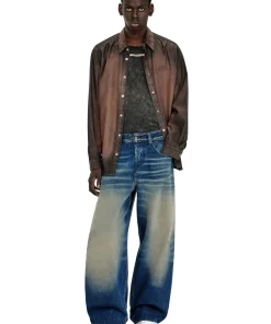 ג׳ינס בגזרה רפויה בצבע כחול כהה עם מותן בינונית, מפשעה נמוכה ורגל רחבה, בסילואטה נינוחה עם מראה קז׳ואלי