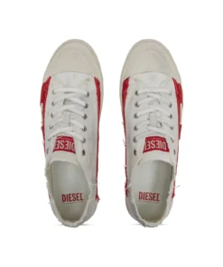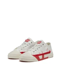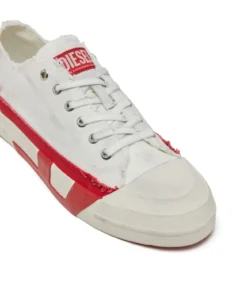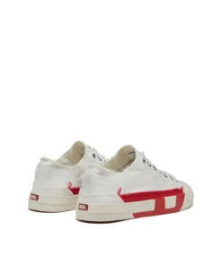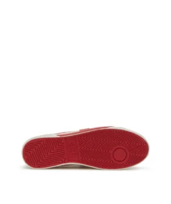 סניקרס וולקנייזד לגברים בצבע לבן/אדום, עם עליונית נמוכה במרקם גריינד ושוליים חתוכים גולמיים, לוגו על הלשון ושרוכים עם ניטי מתכת, וסולייה מעט מוגבהת עם אינסרטים המדגישים את צורת ה-D