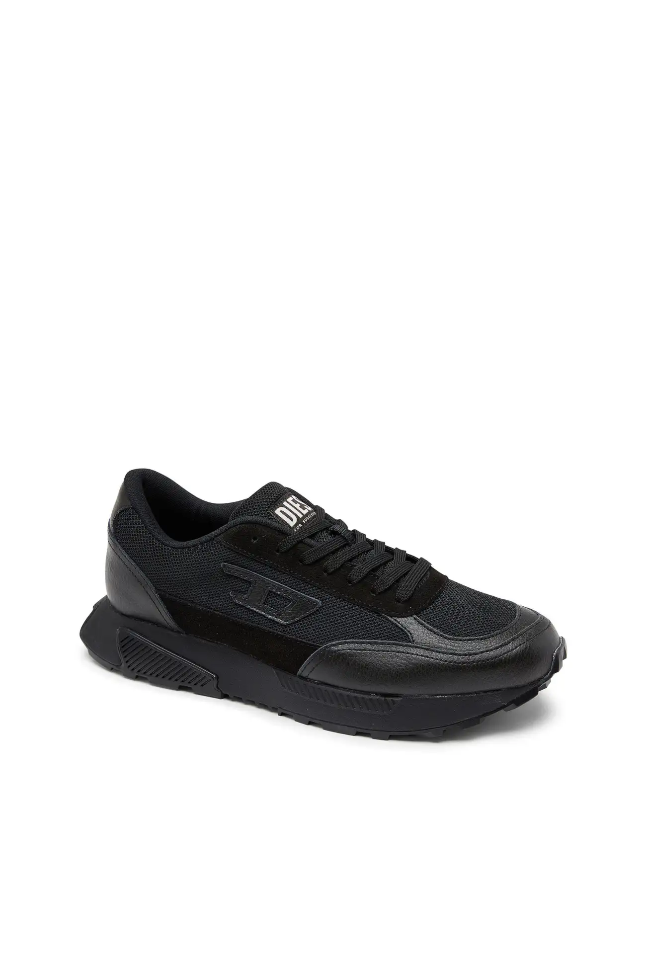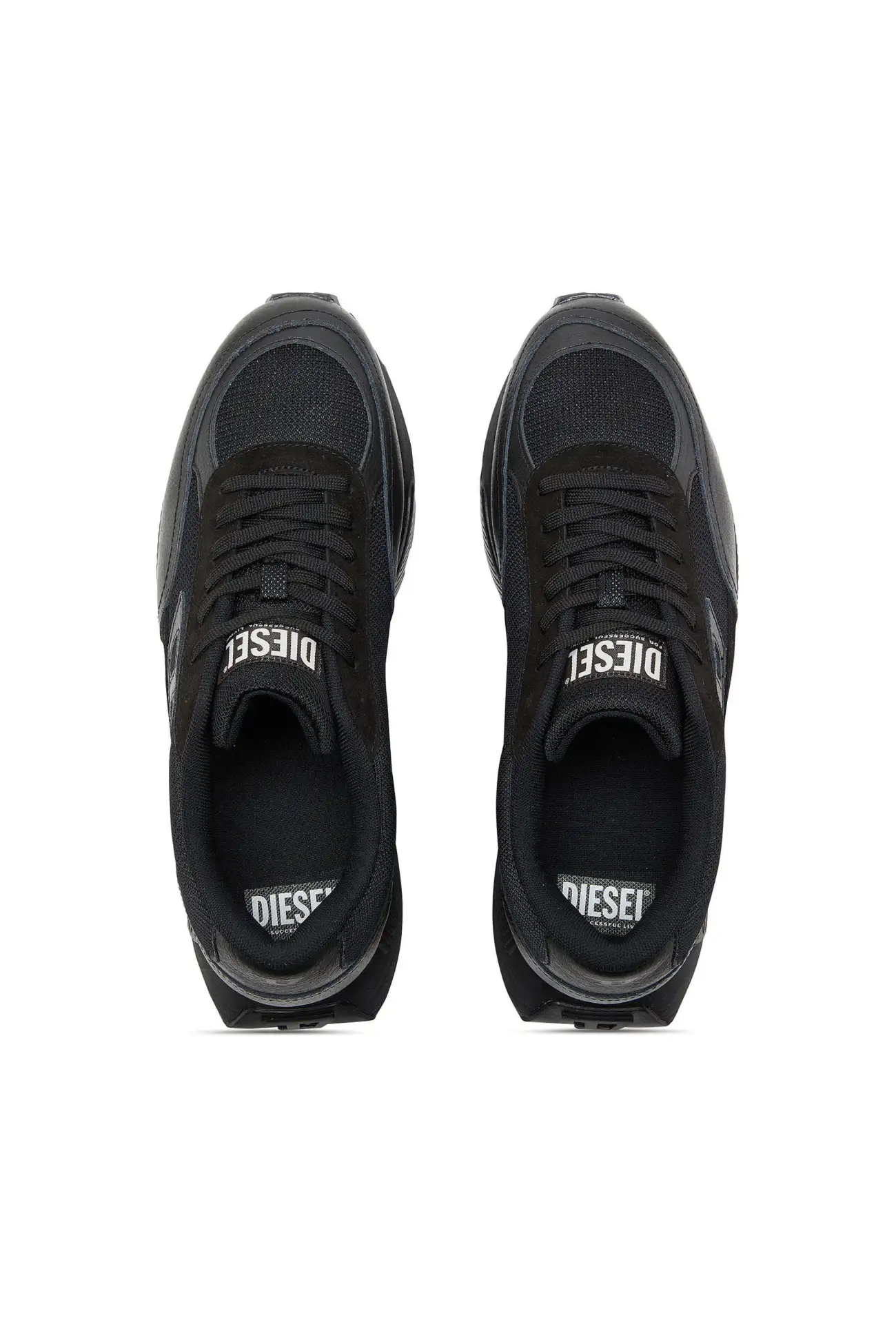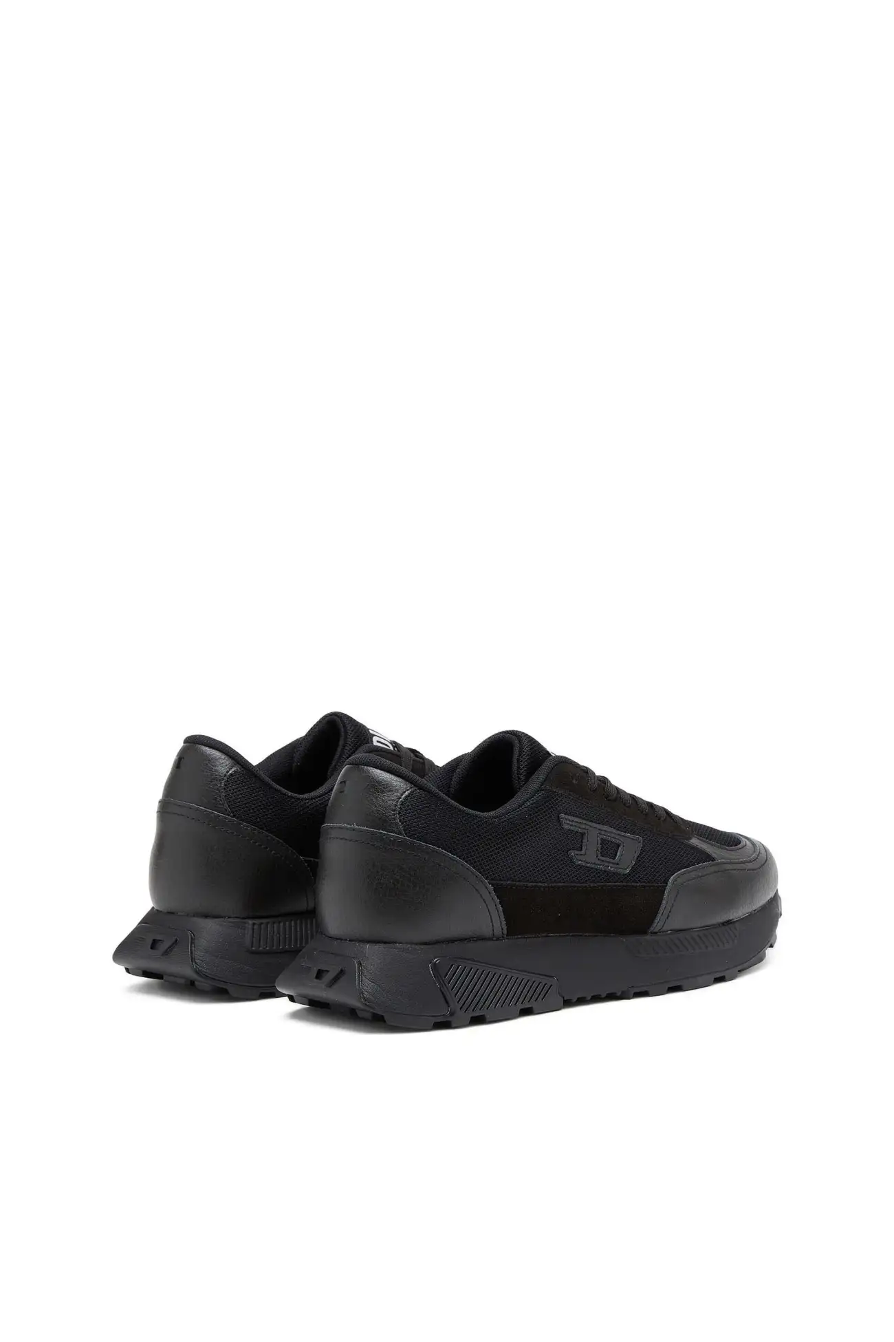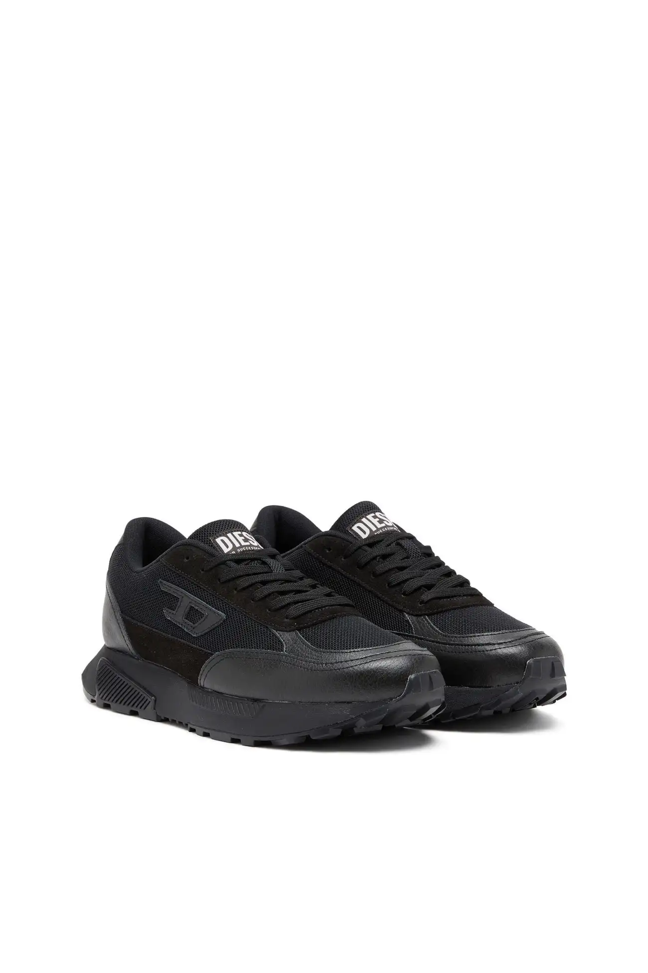 Mens low top sneakers combining suede, leather and mesh. The upper is enriched by a bold D logo in leather on the side and a Diesel Biscotto logo on the mesh tongue. The heel tab features D logo branding. A rubber and EVA outsole completes the design. Contrasting tones add a fresh touch.
