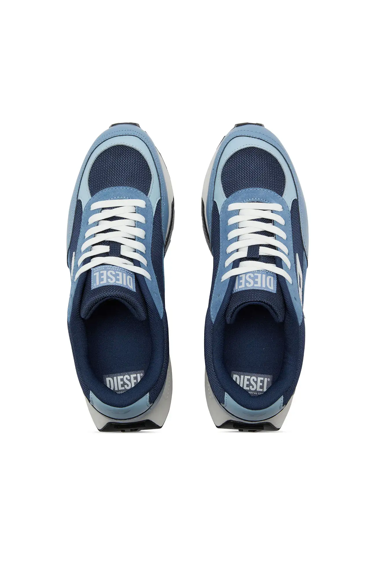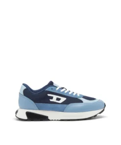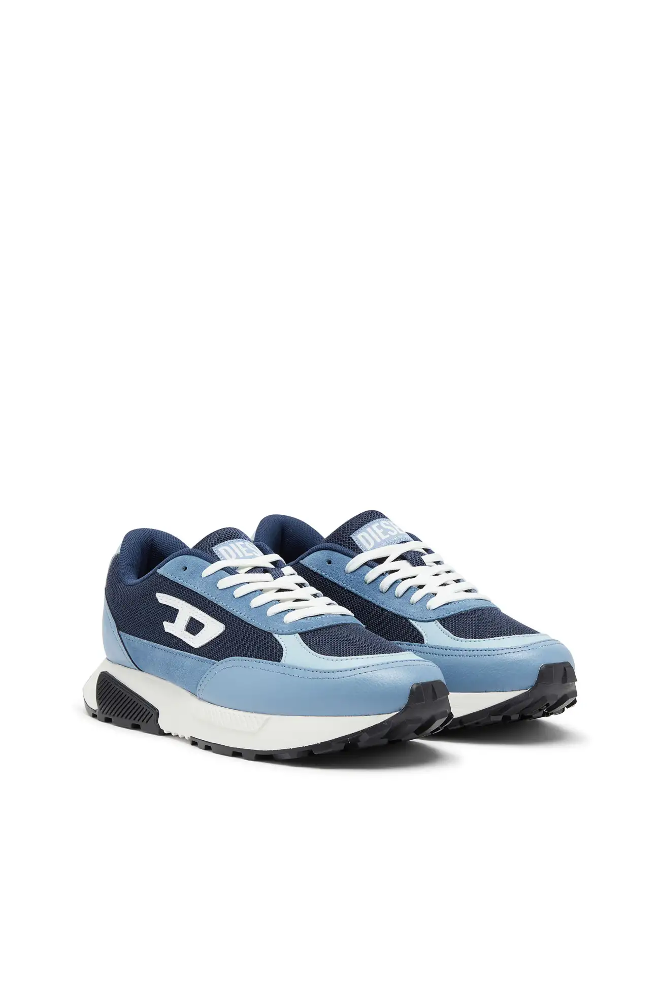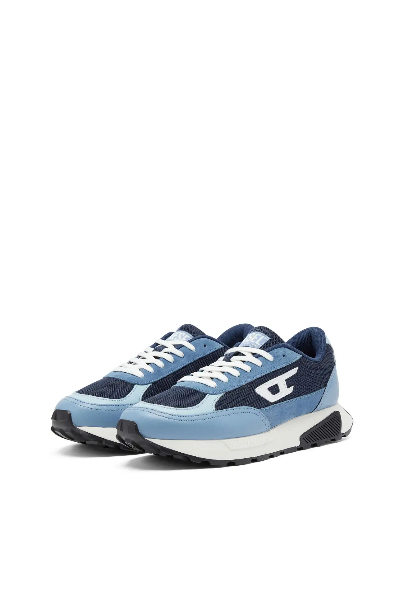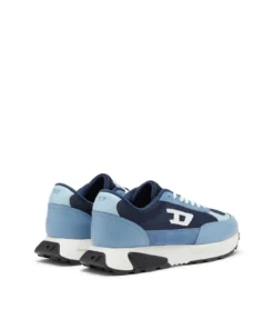 Mens low top sneakers combining suede, leather and mesh. The upper is enriched by a bold D logo in leather on the side and a Diesel Biscotto logo on the mesh tongue. The heel tab features D logo branding. A rubber and EVA outsole completes the design. Contrasting tones add a fresh touch.