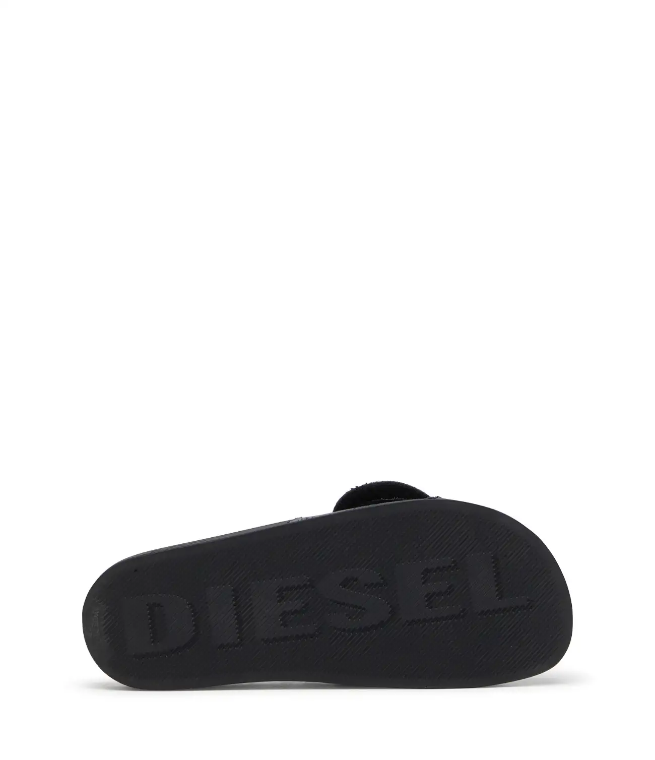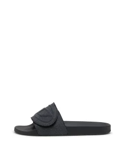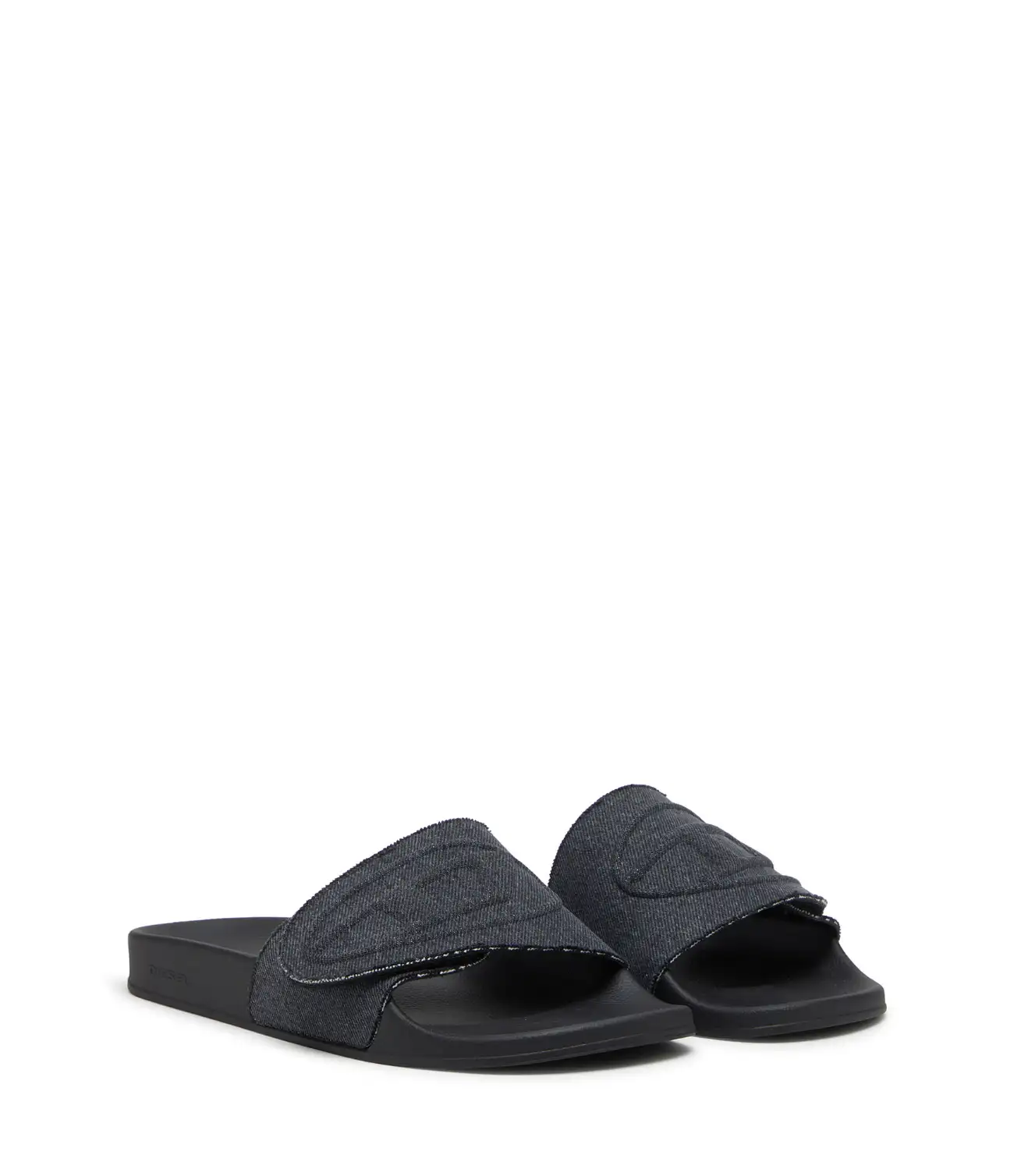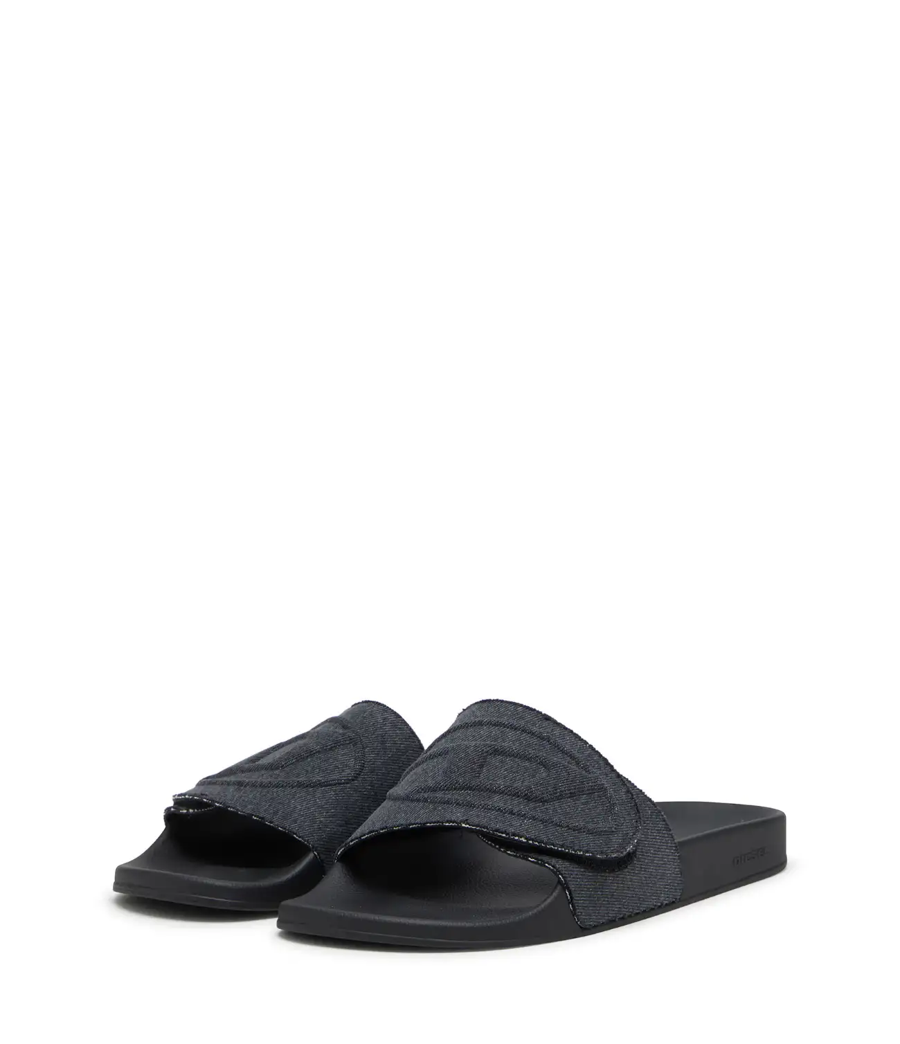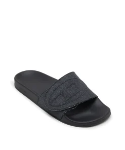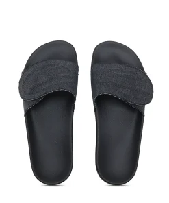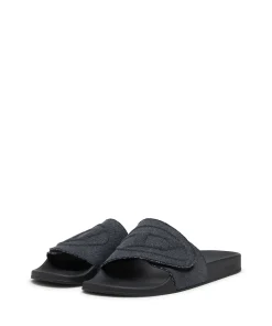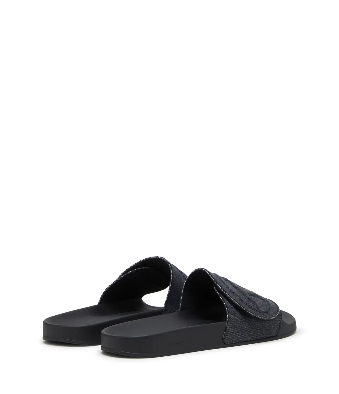כפכפי סלייד בצבע שחור עם רצועת דנים מחוספסת ולוגו אובלי מובלט, בעיצוב קז׳ואלי עם נוכחות, על סוליה שטוחה לנוחות יומיומית