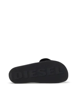 כפכפי סלייד מדנים עם לוגו אובלי מובלט במראה מחוספס – שחור