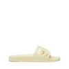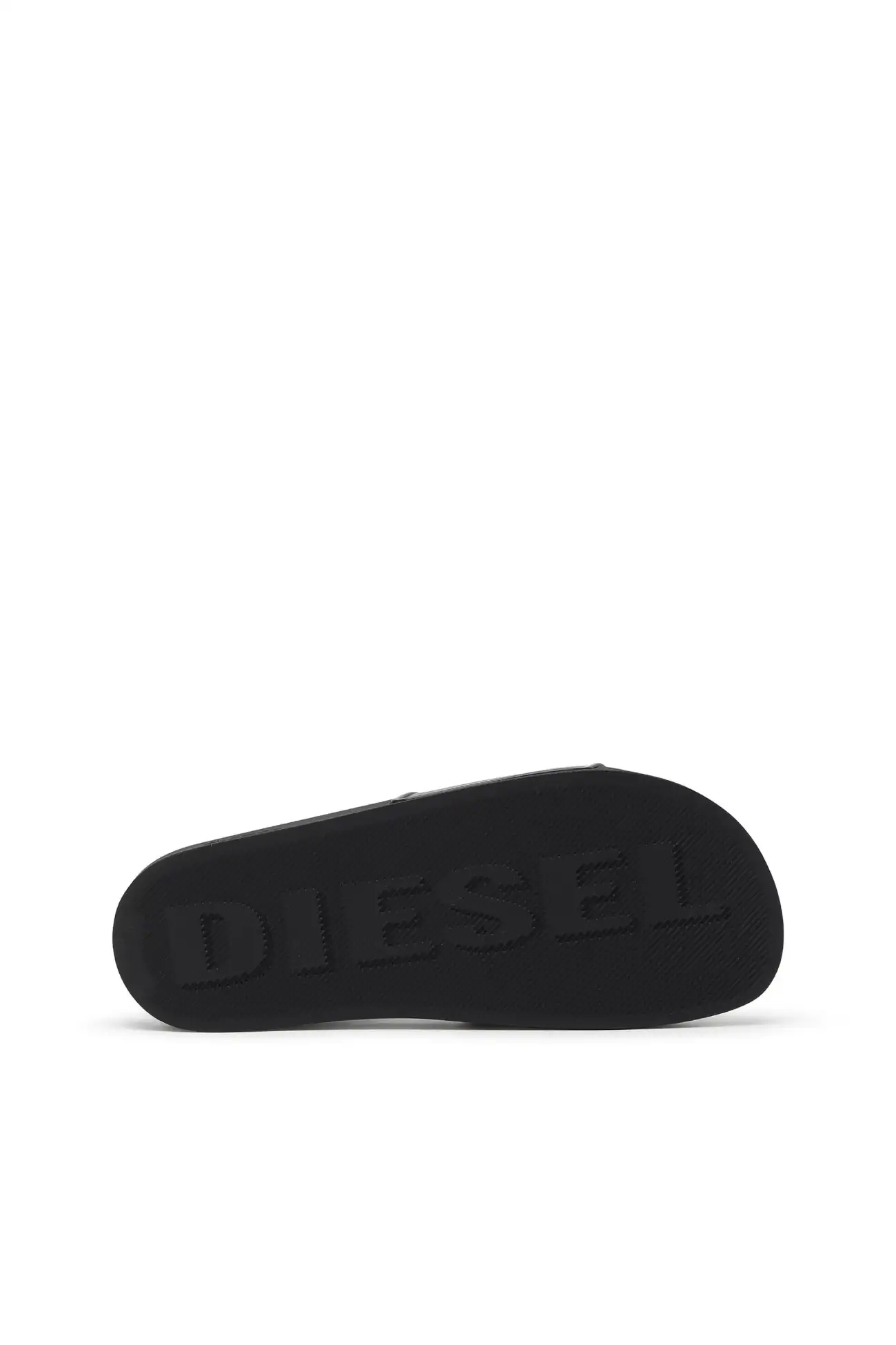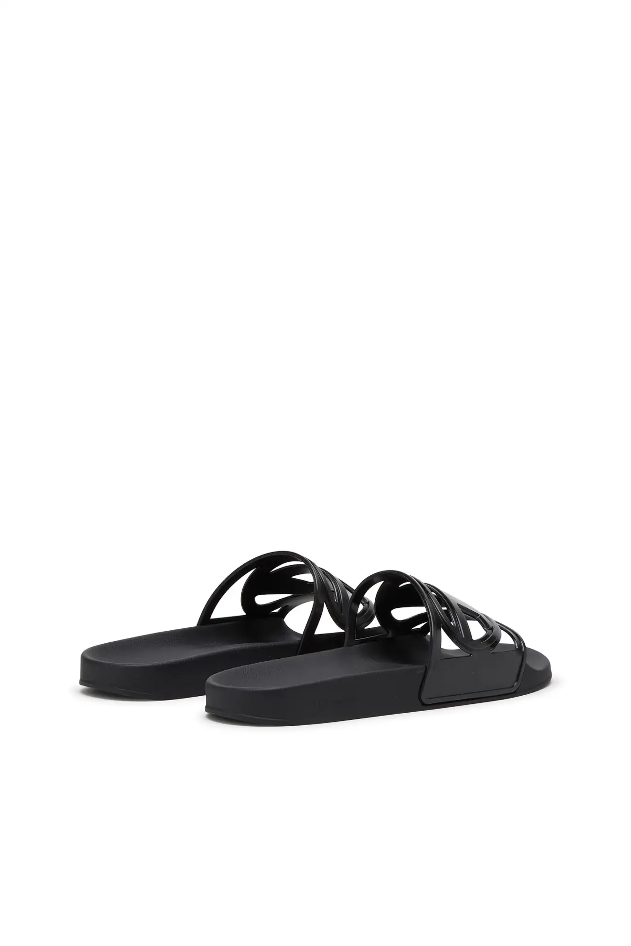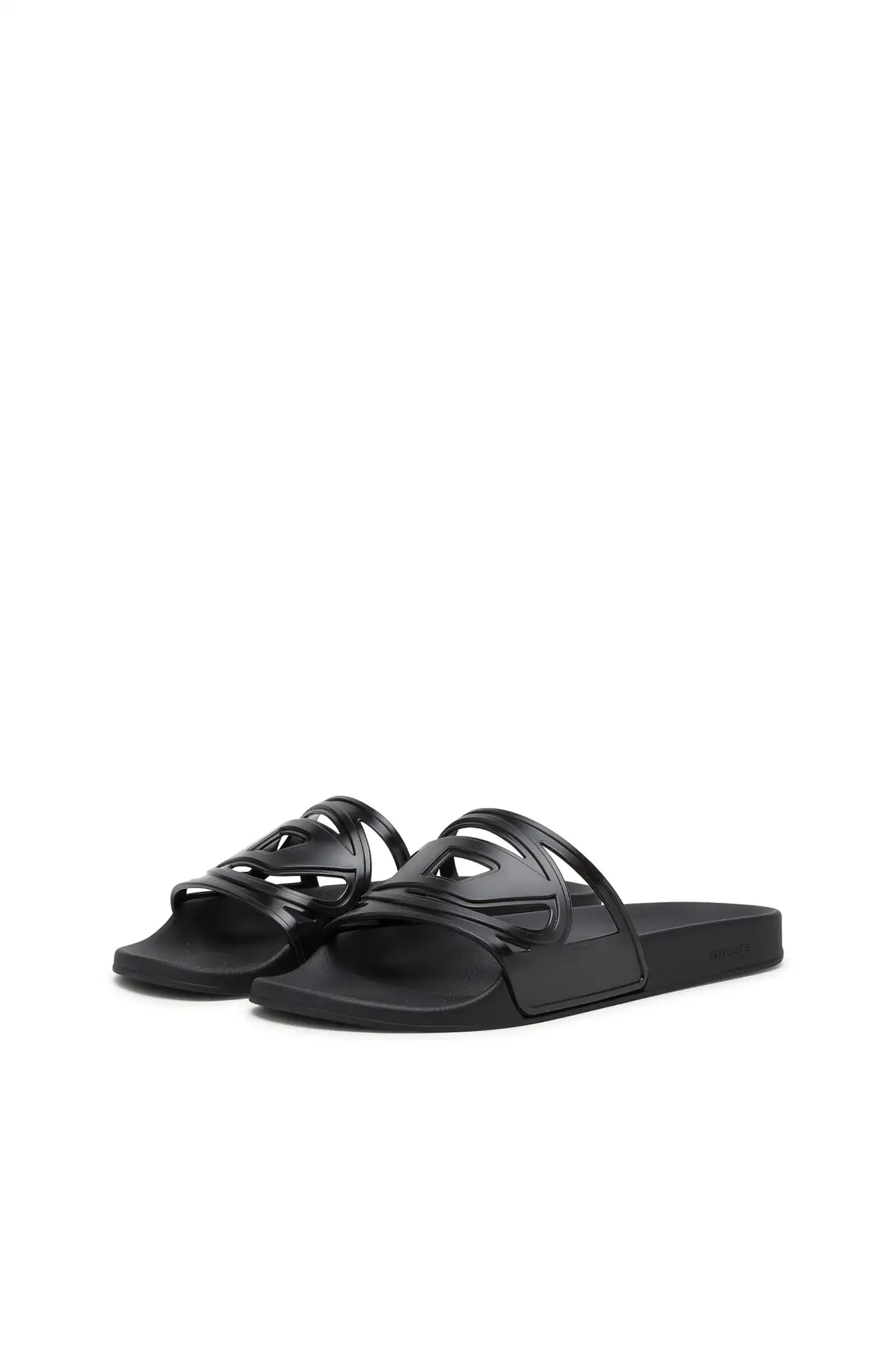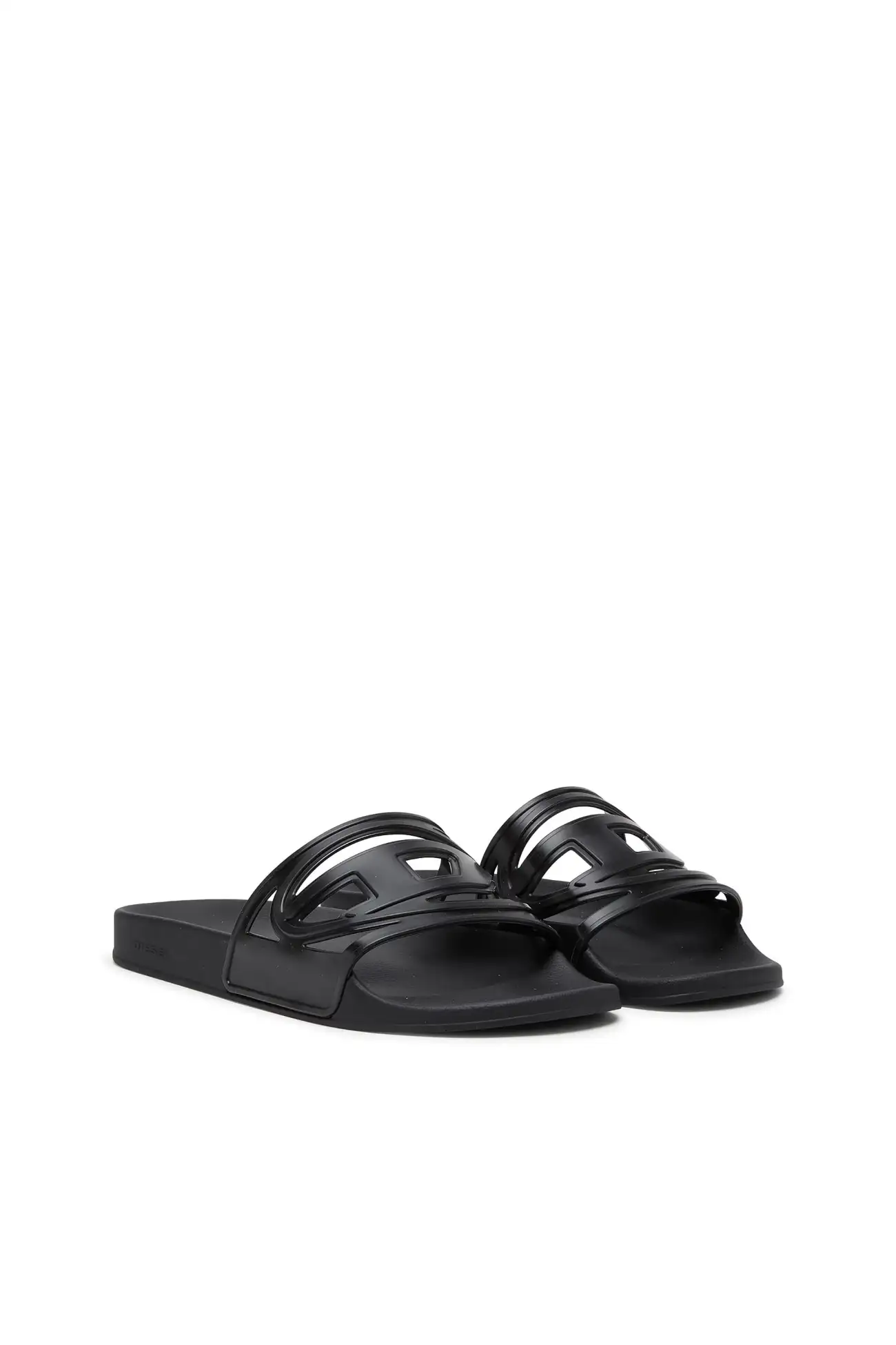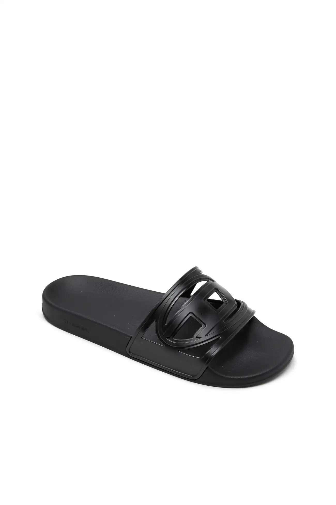 These slide sandals in black reinterpret Diesel’s iconic Oval D logo as a sculptural cut-out across the wide strap. Crafted from lightweight molded rubber, the design delivers comfort through a smooth footbed and flat sole, while the dark monochrome finish sharpens the bold, graphic character of the style