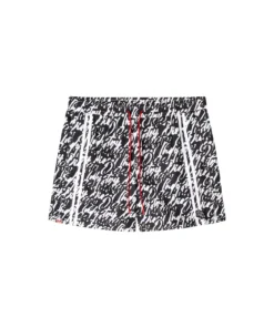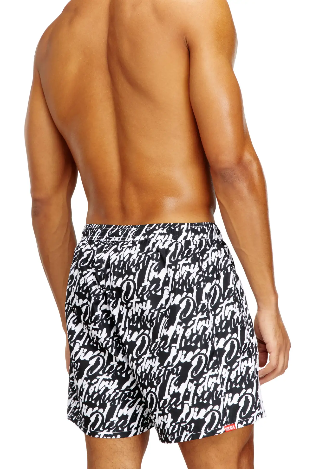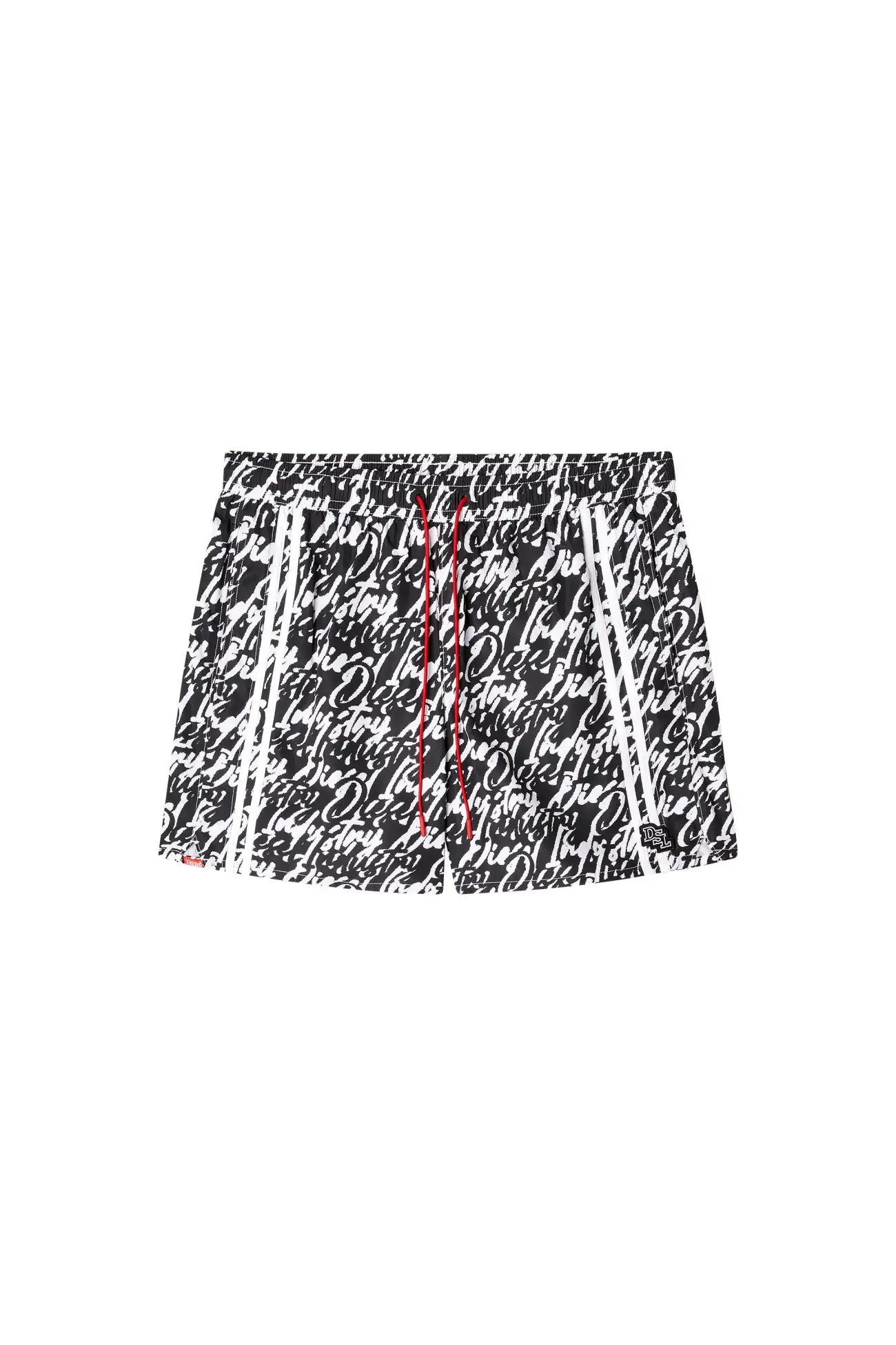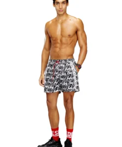 Medium-length swimming trunks made of recycled nylon with mesh pocket lining. The shorts feature an all-over graphic print that interprets the Diesel logo in fluid lettering. Complete with a contrasting drawcord with branded rubber tips, a signature rubber eyelet at the center front, and two solid side stripes for a sporty twist. A DSL patch is embroidered at the front left hem.
