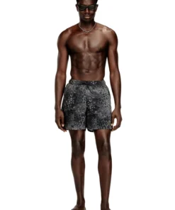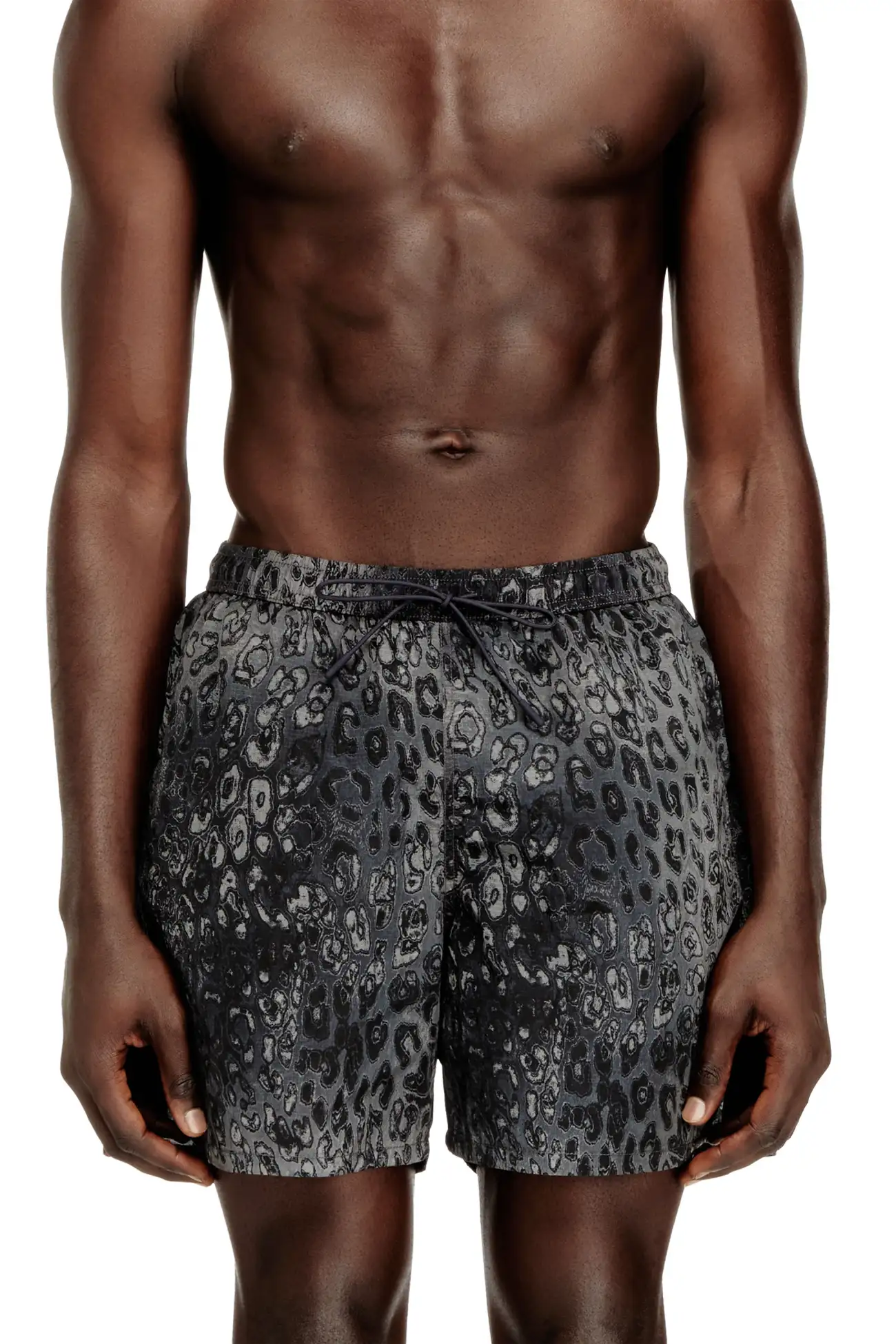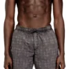 מכנסי שורטס שחייה בצבע אפור מניילון ריפסטופ עם הדפס מנומר כולל, מעוצבים עם מותן אלסטית ושרוך ולוגו מתכתי קטן בשוליים