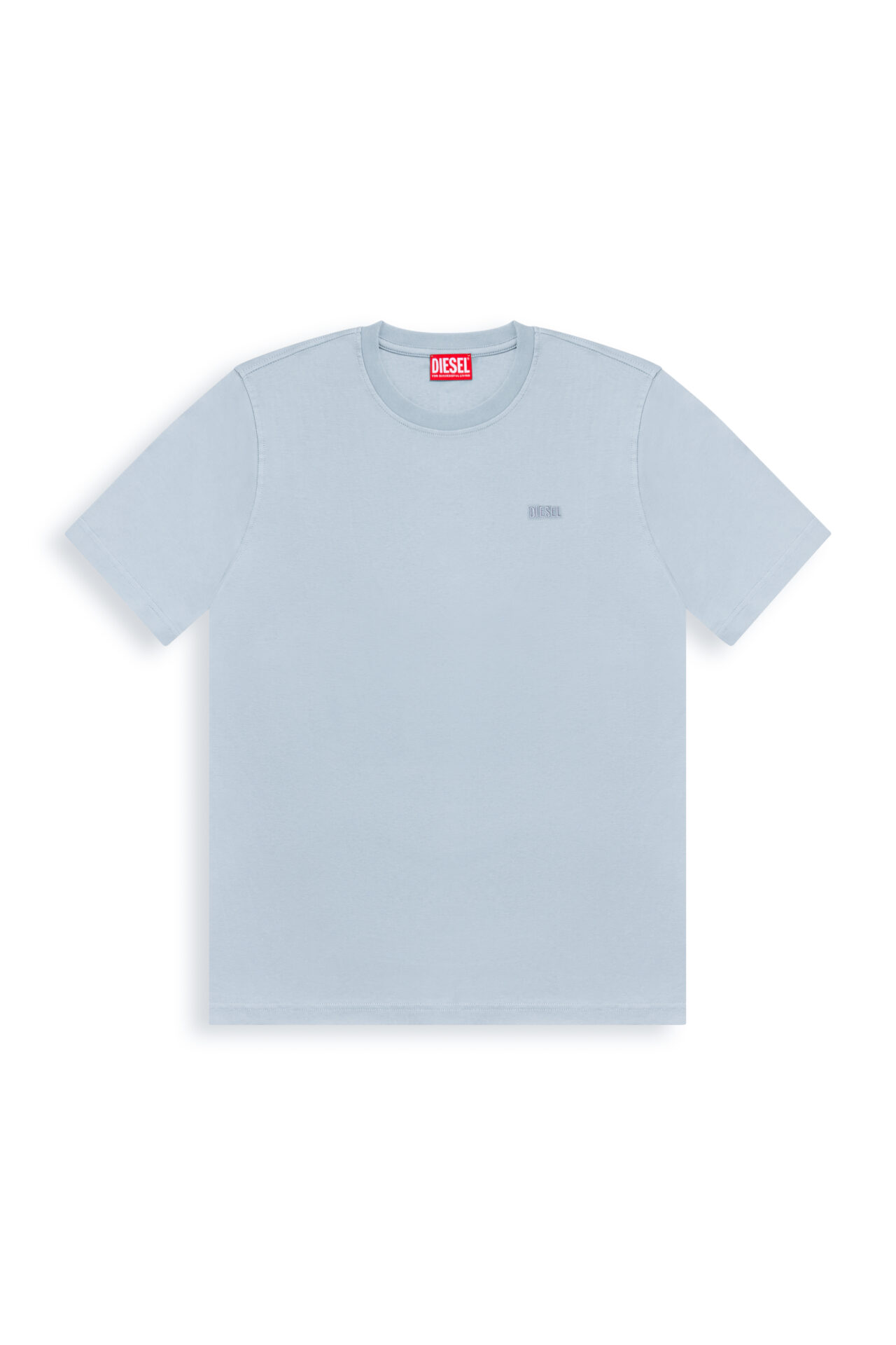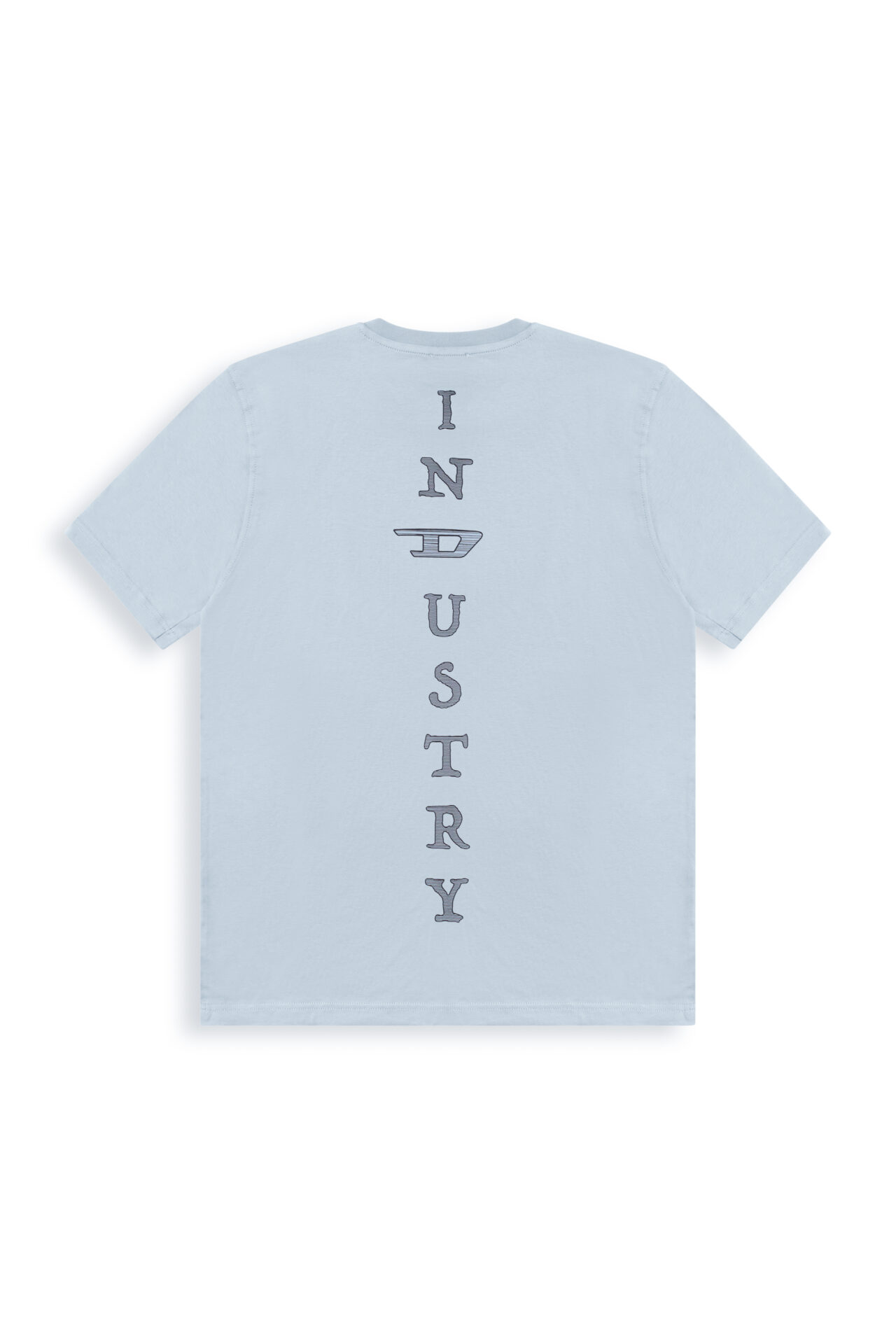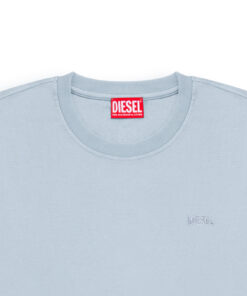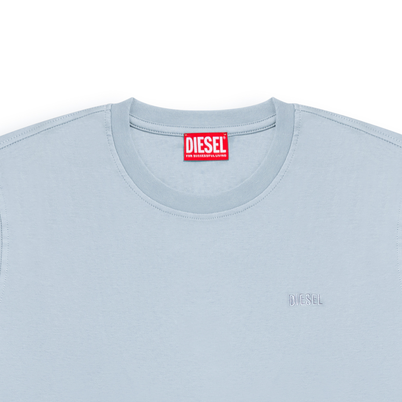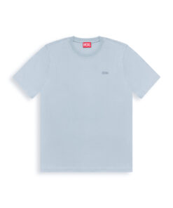 חולצת טי קצרה בצבע כחול בהיר עם אותיות לוגו מאוירות לאורך הגב ורקמת לוגו קטנה בצד החזה