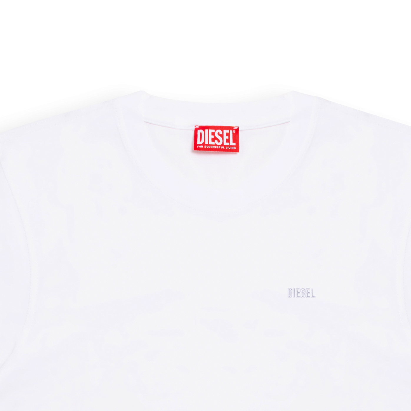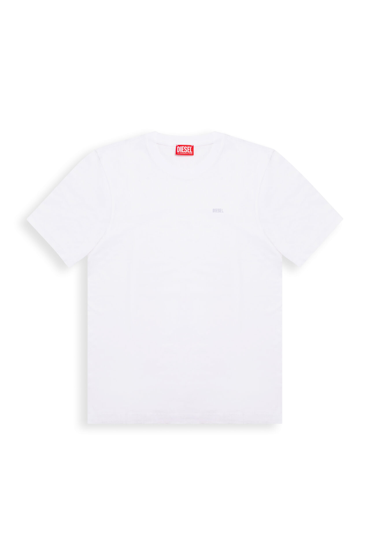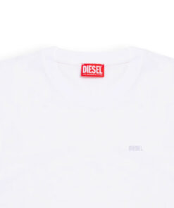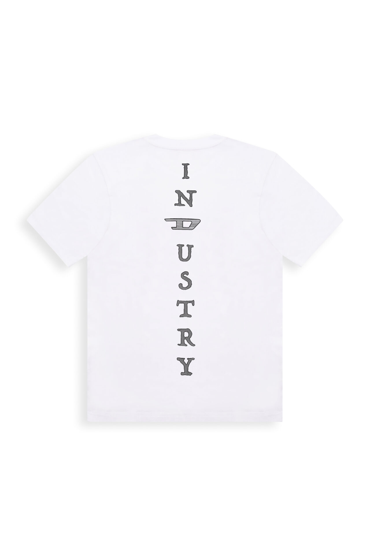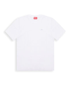 חולצת טי קצרה בצבע לבן עם אותיות לוגו מאוירות לאורך הגב ורקמת לוגו קטנה בצד החזה