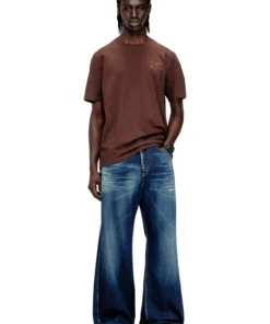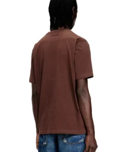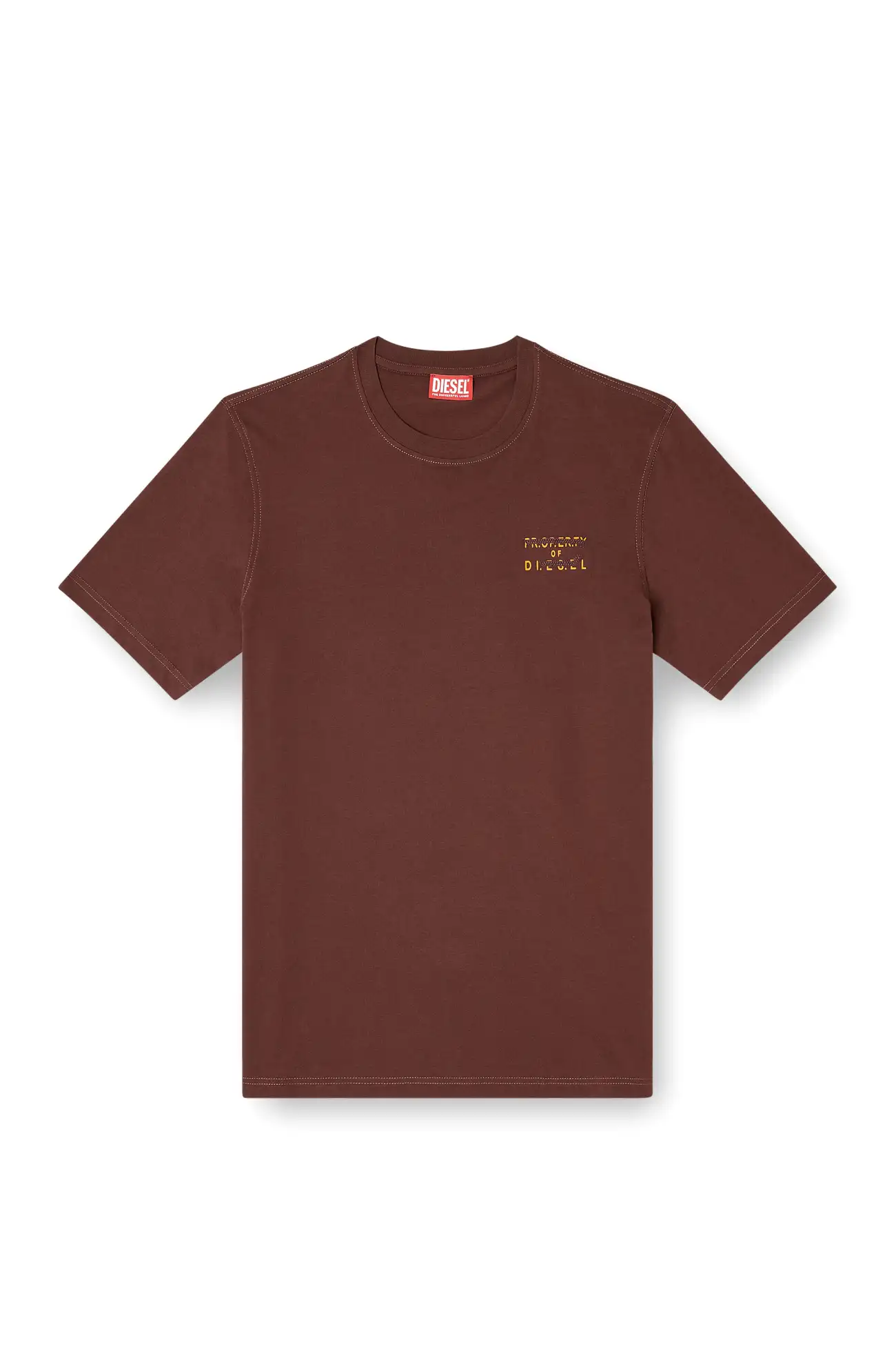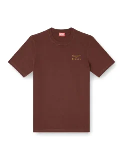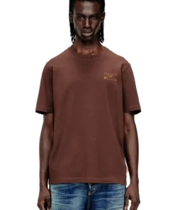 טישרט בגזרה רגילה בגוון חום עשויה כותנה אורגנית ג׳רזי קל עם צווארון עגול ושרוולים קצרים. כיתוב מודפס במים בחזה מודגש בדיטייל הדפס תלת-ממדי D ותווית דגל Diesel בצד.