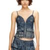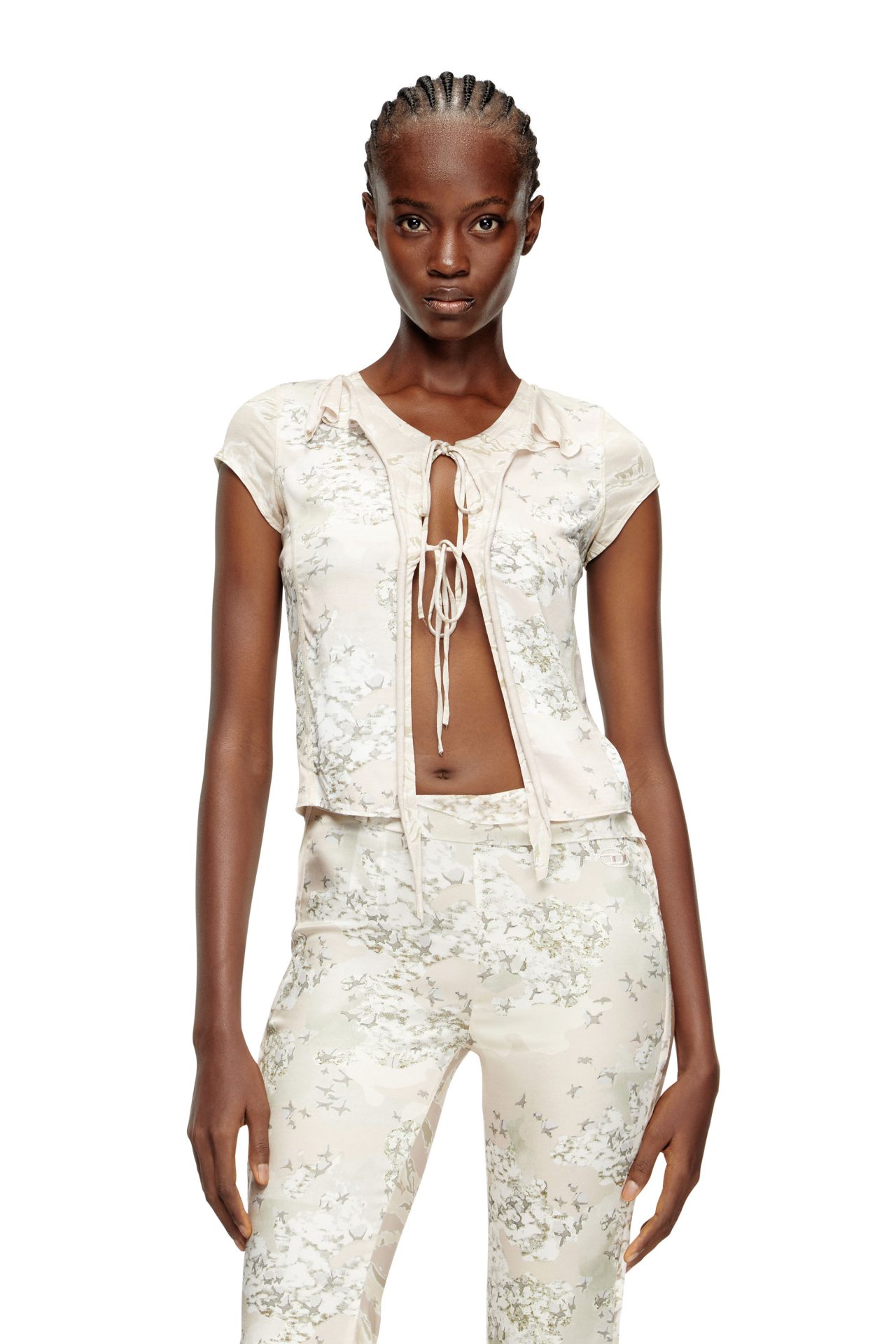 This women's short-sleeve top sculpts the body in stretch nylon, panelled from a mash-up of beige camouflage prints. Raw-cut flounces edge its slim silhouette, fastening with delicate ties that reveal a hint of skin. Hallmarked with Oval D embroidery on the chest.