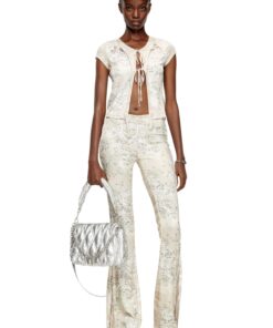 חולצה קצרה עם הדפס הסוואה בגווני בז׳ וקרם, עם קשירות בחזית שיוצרות מחשוף וגימורי וולנים בגזירה גולמית