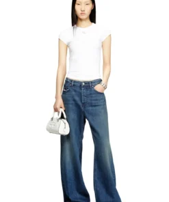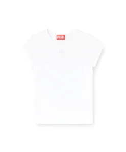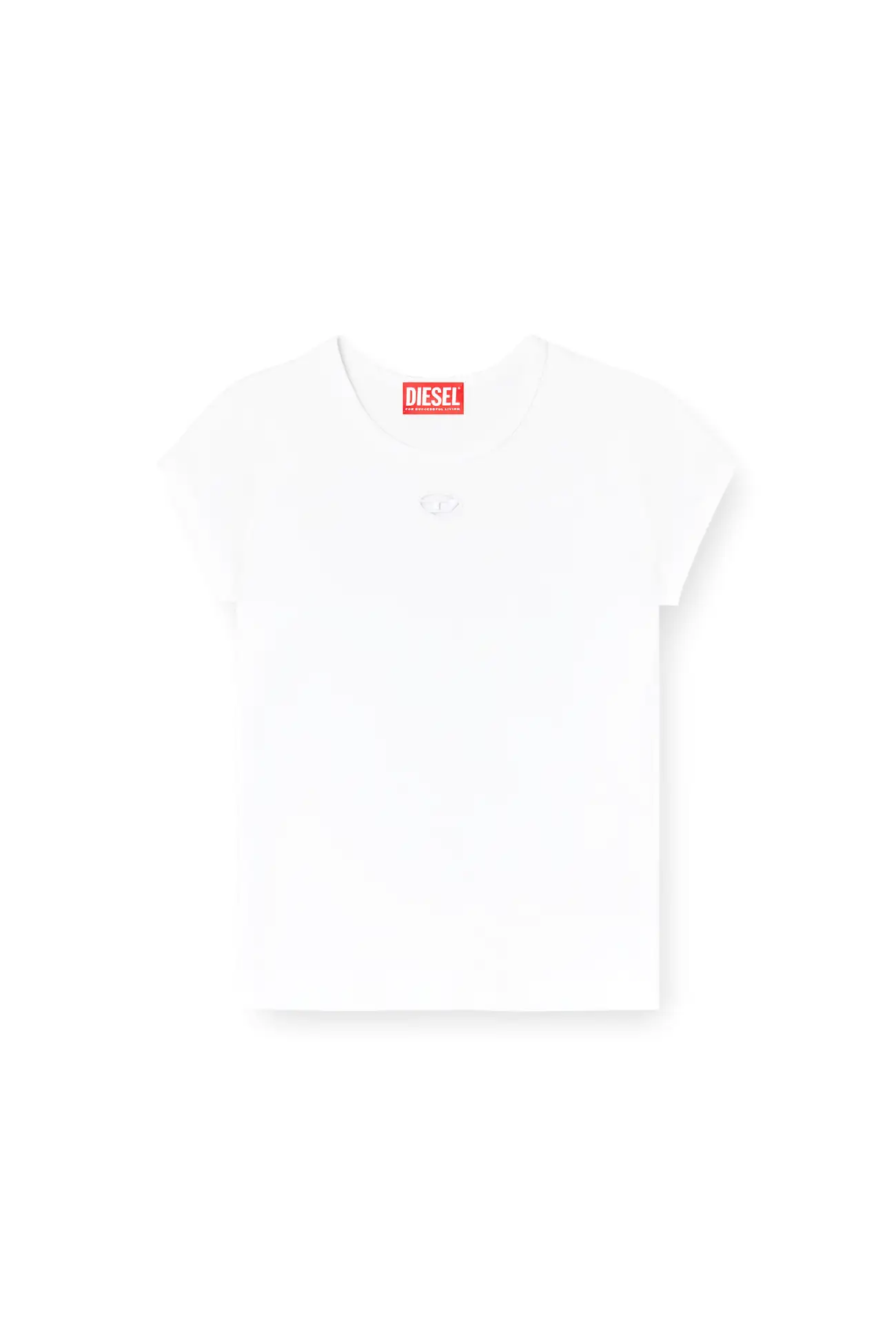 טופ נשים צמוד בצבע לבן בגזרה נקייה ומינימליסטית, עשוי כותנה אורגנית עם תוספת גמישות, לוגו דיזל מתכתי אובל די בחיתוך לייזר ורקמה בחזית החושפים הצצה לשכבה שמתחת