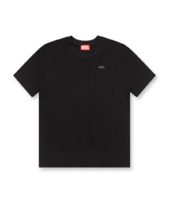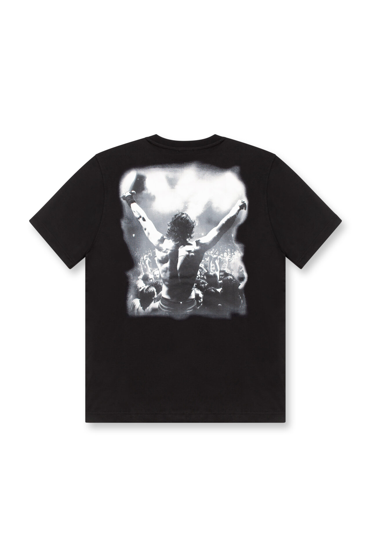 חולצת טי קצרה בצבע שחור עם הדפס תמונה על הגב והדפס לוגו קטן בצד החזה