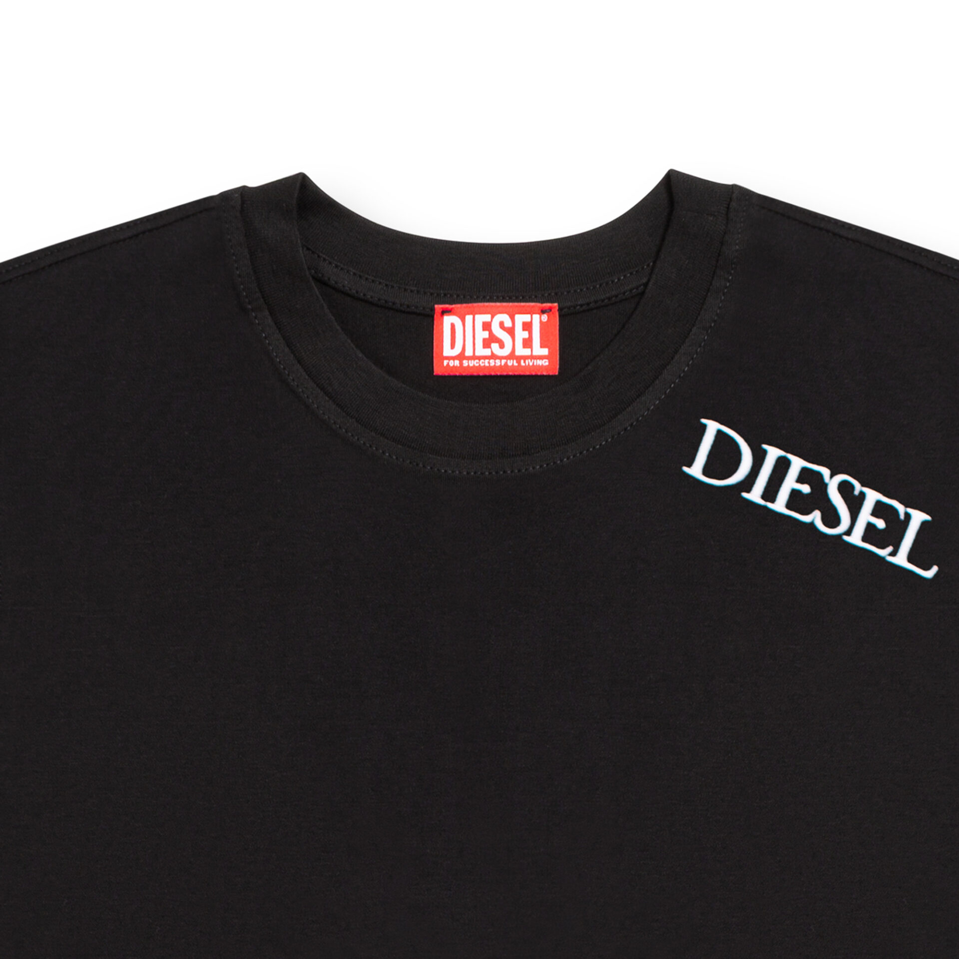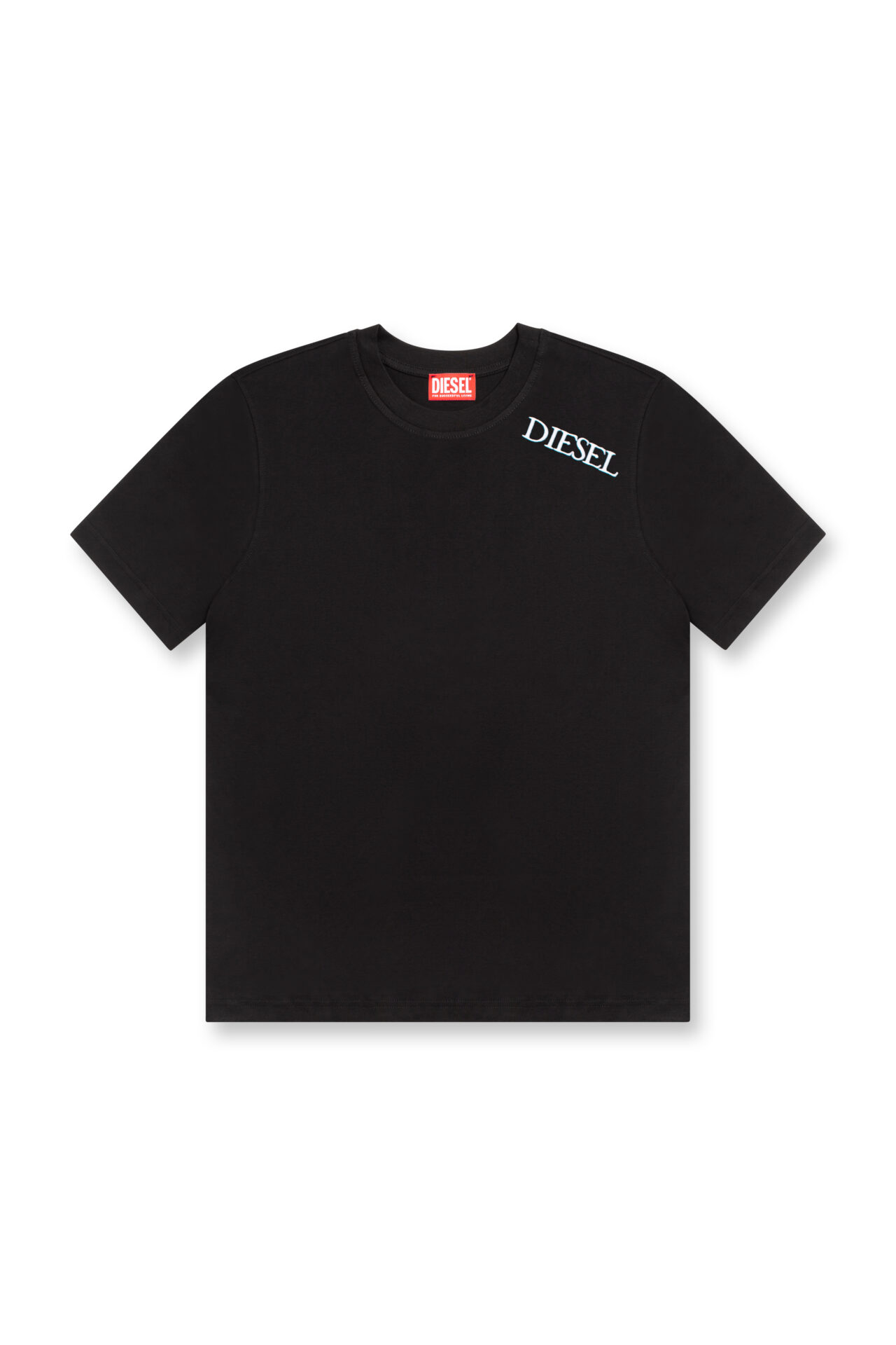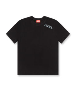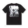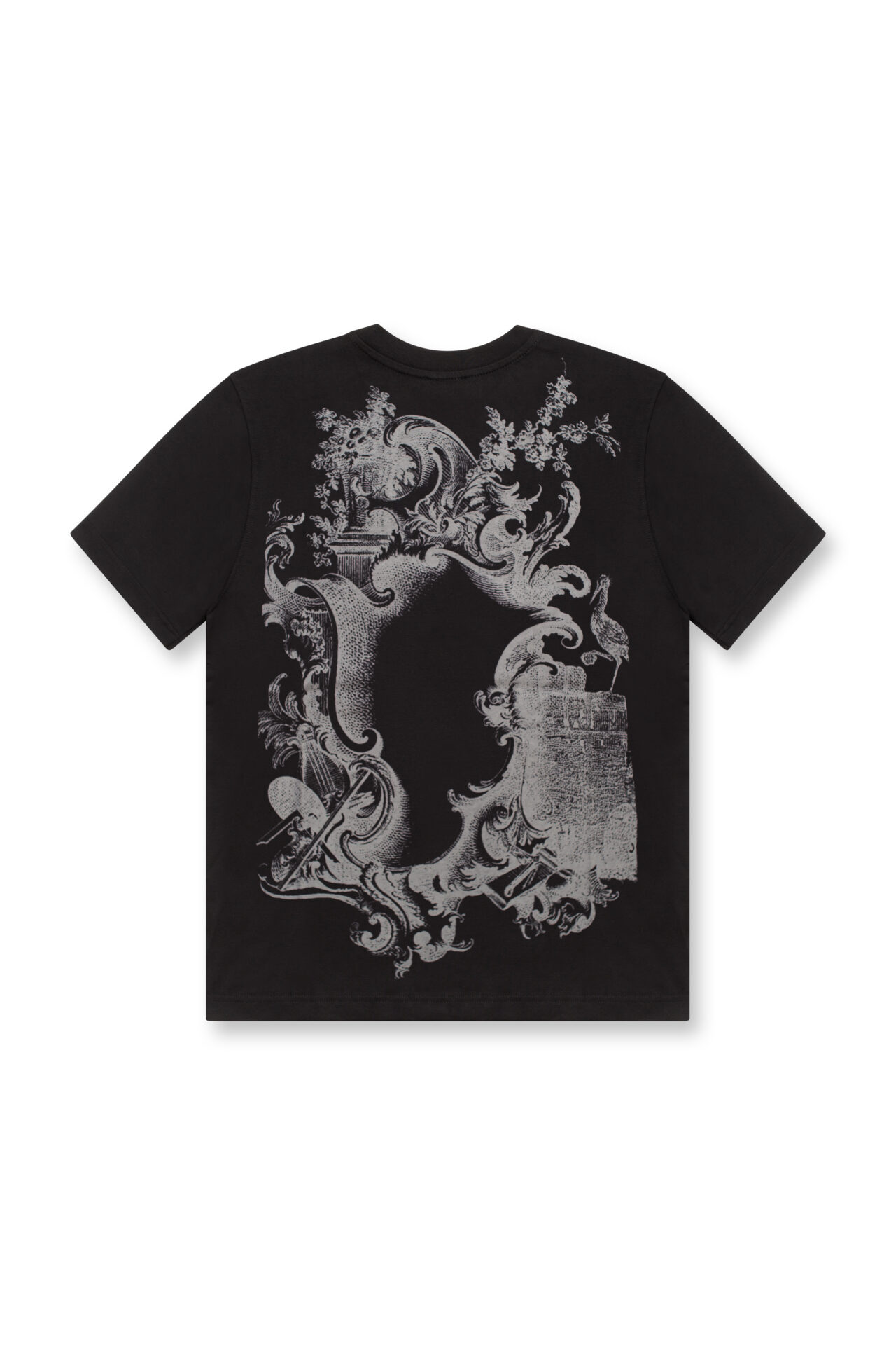 חולצת טי קצרה בצבע שחור עם הדפס גדול על הגב בסגנון גותי והדפס לוגו קטן אלכסוני בצד הצווארון