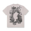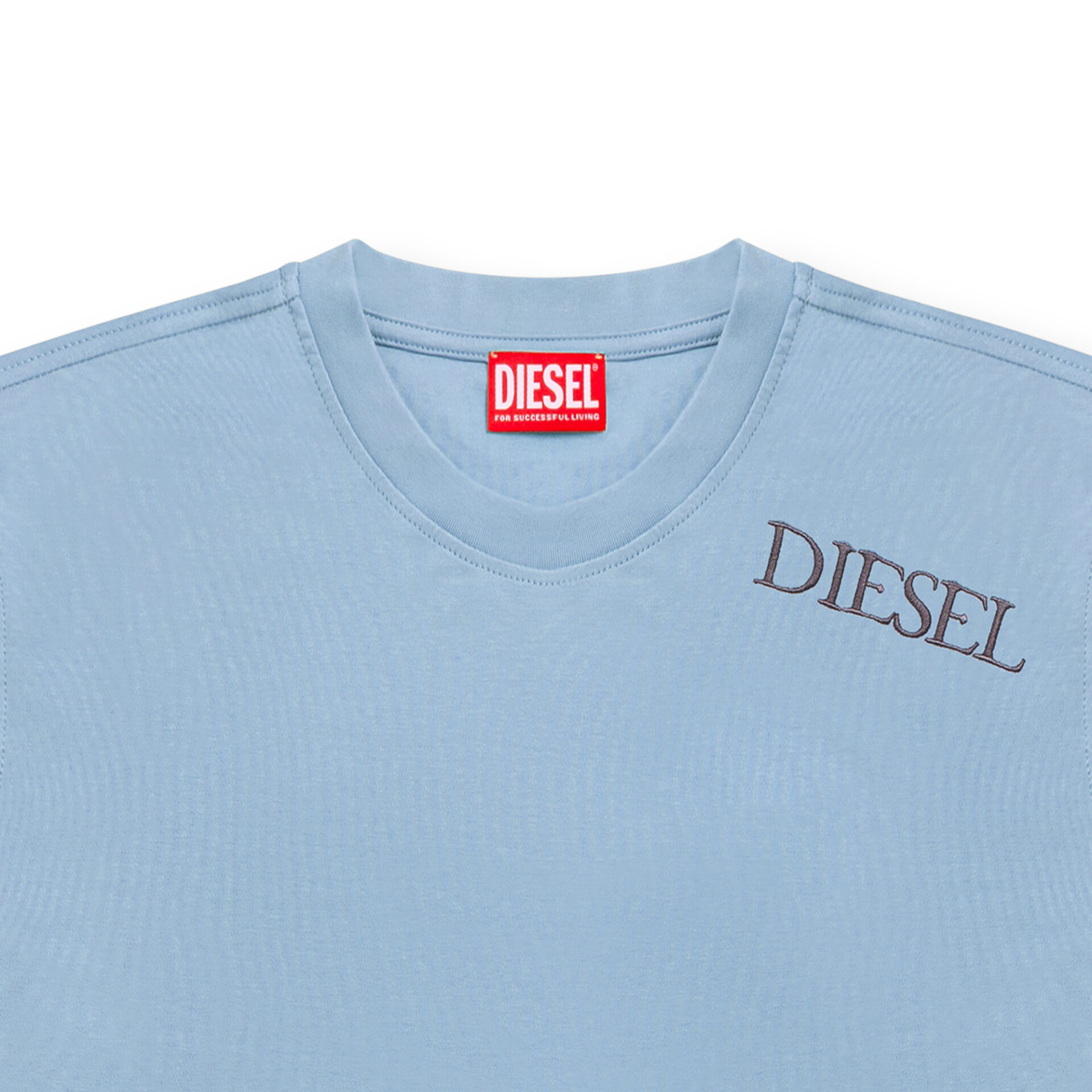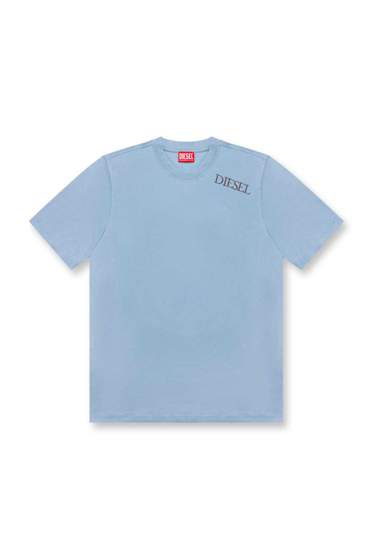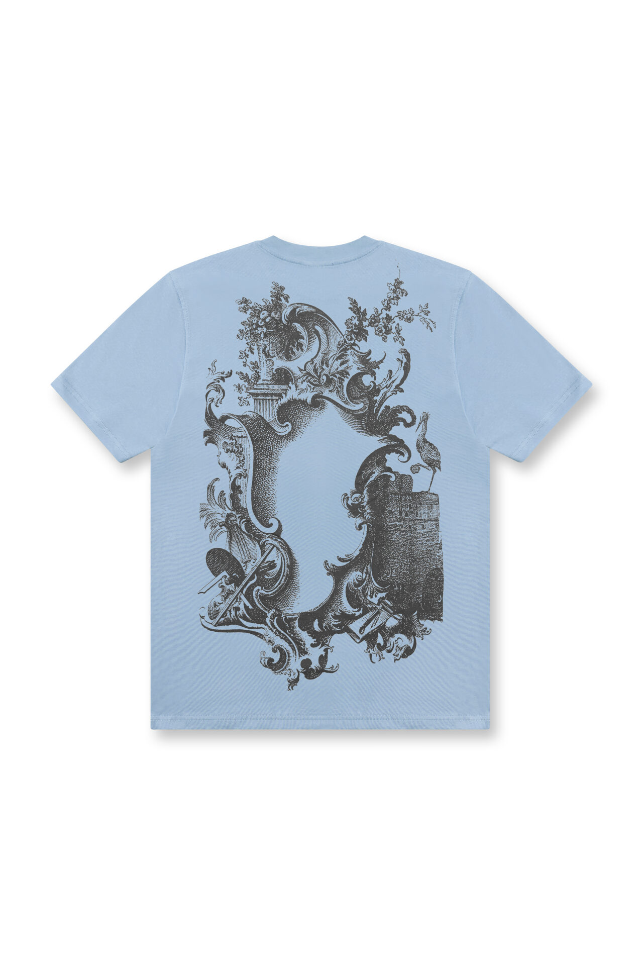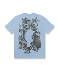חולצת טי קצרה בצבע כחול בהיר עם הדפס גדול על הגב בסגנון גותי והדפס לוגו קטן אלכסוני בצד הצווארון