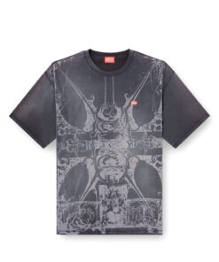 חולצת טי קצרה בגזרה משוחררת בצבע אפור עם הדפס דיגיטלי בסגנון גותי. החולצה צבועה מצדה הפנימי לקבלת מראה דהוי
