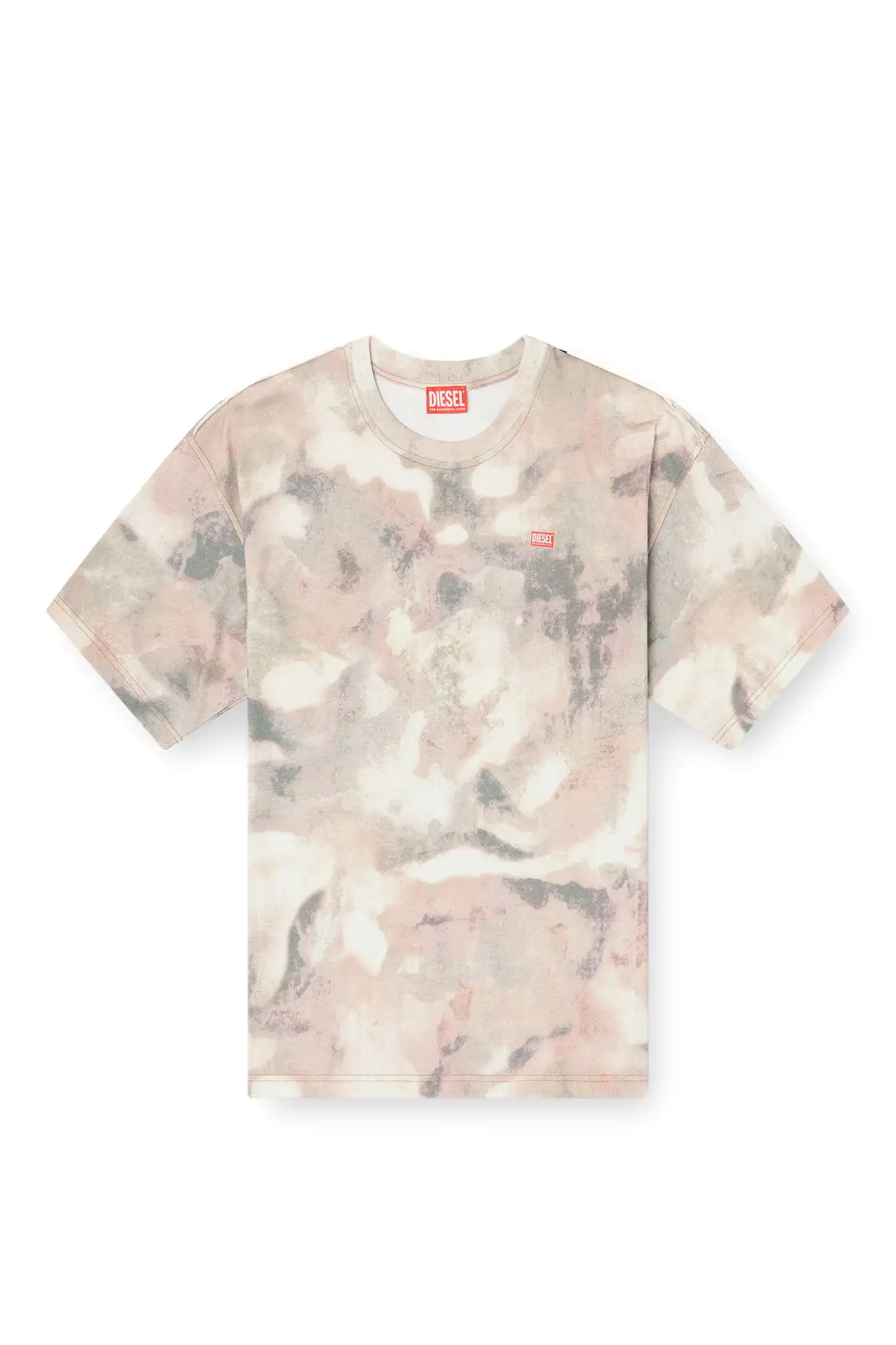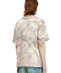 Relaxed fit men's T-shirt in compact jersey, featuring a crew neck and short sleeves. Detailed with an all-over digital camouflage print and a Diesel logo transfer on the left chest. Contrast cover stitching frames the design.