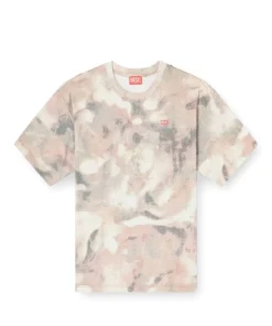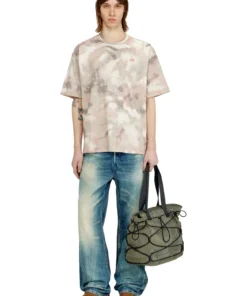 טישרט שרוול קצר מכותנה עבה בצבע בז'/חום בגזרה רילקס עם צווארון עגול, מעוטרת בהדפס קמו דיגיטלי כולל ובהעברת לוגו דיזל בחזה
