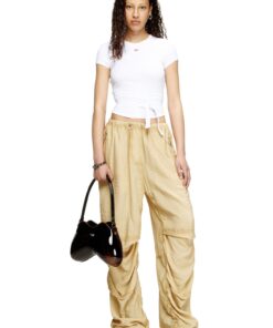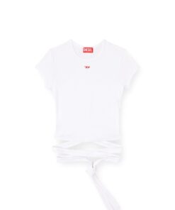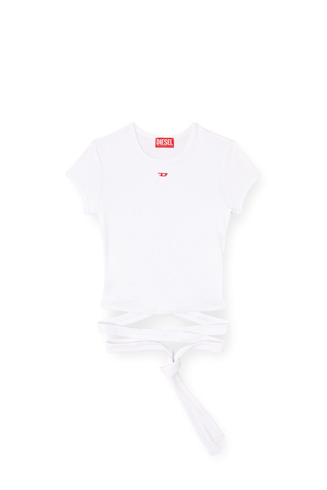 חולצת טי קצרה לבנה בגזרה צמודה, עשויה כותנת ריב אורגנית אלסטית. החלק התחתון בנוי כרצועות שנכרכות סביב הגוף ונקשרות בקשר שיוצר מחשוף גב, עם פאץ׳ לוגו D קטן על החזה