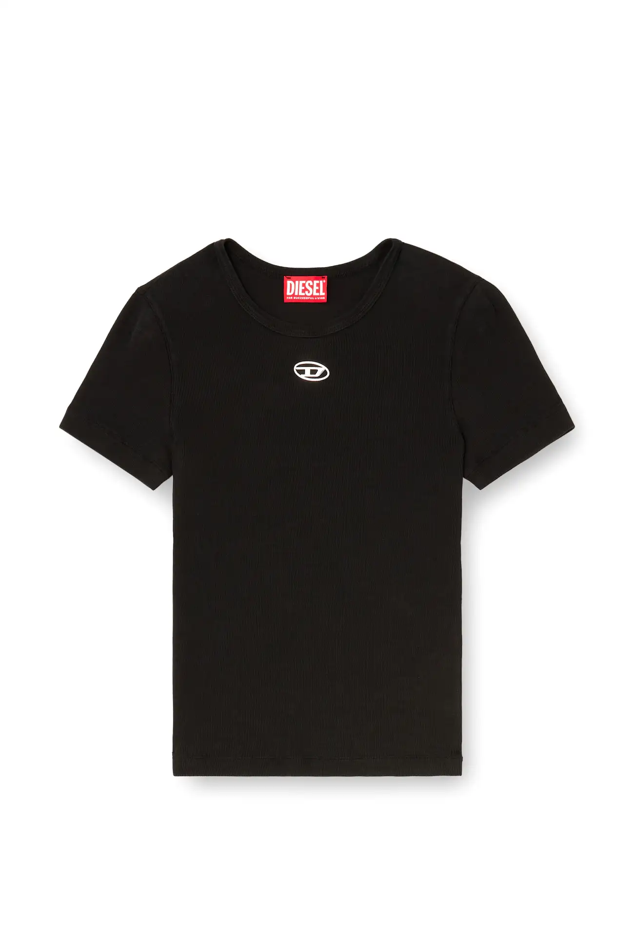 טישרט ריב צמודה עם צווארון קרו ושרוול קצר, צבע שחור, כותנה ריב עם אלסטן, לוגו Oval D מטאלי מודפס מתחת לקו הצוואר, שטיפה למגע רך