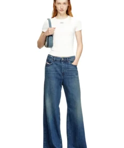Slim fit T-shirt with a crew neck and short sleeves. Made of a finely-ribbed cotton and elastane blend, it ensures comfort and a snug fit. The injection-printed metallic Oval D logo just below the neck adds a distinctive touch. The top has undergone fabric dyeing and garment washing for a soft, lived-in texture.